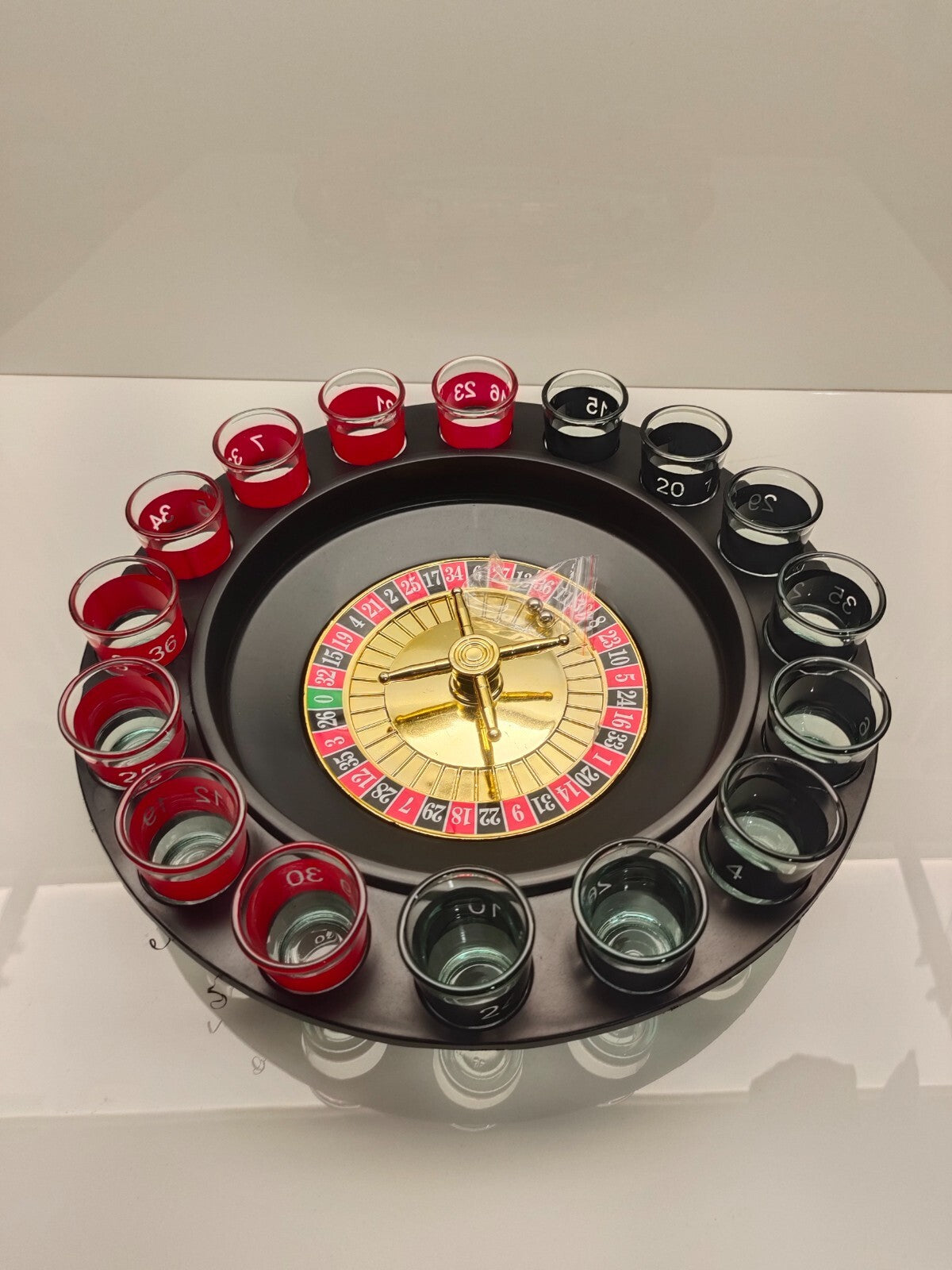 16 Shot Glasses: Included are 16 mini shot glasses that fit neatly into the numbered slots on the roulette wheel. Each glass is perfectly sized for a single shot, ensuring your game is both fun and manageable.