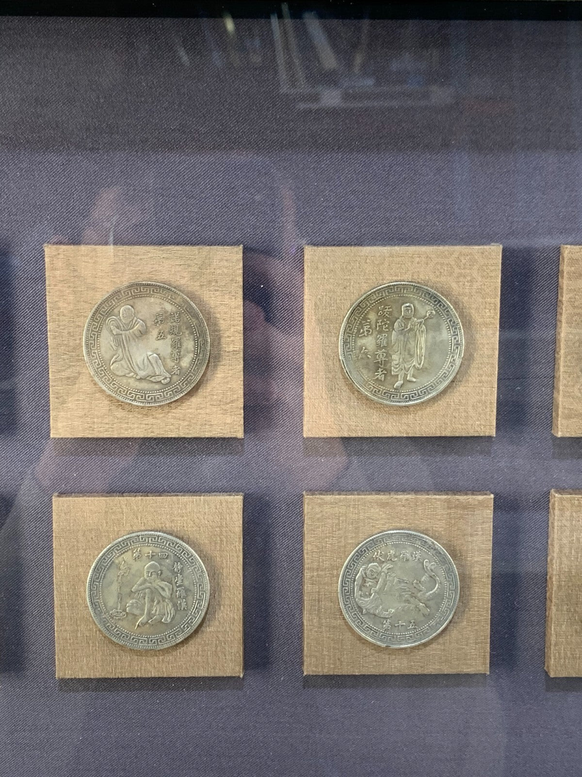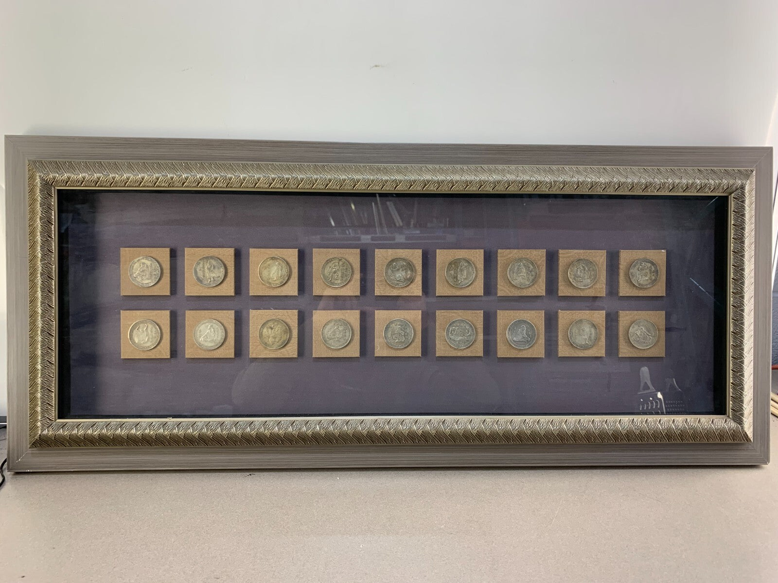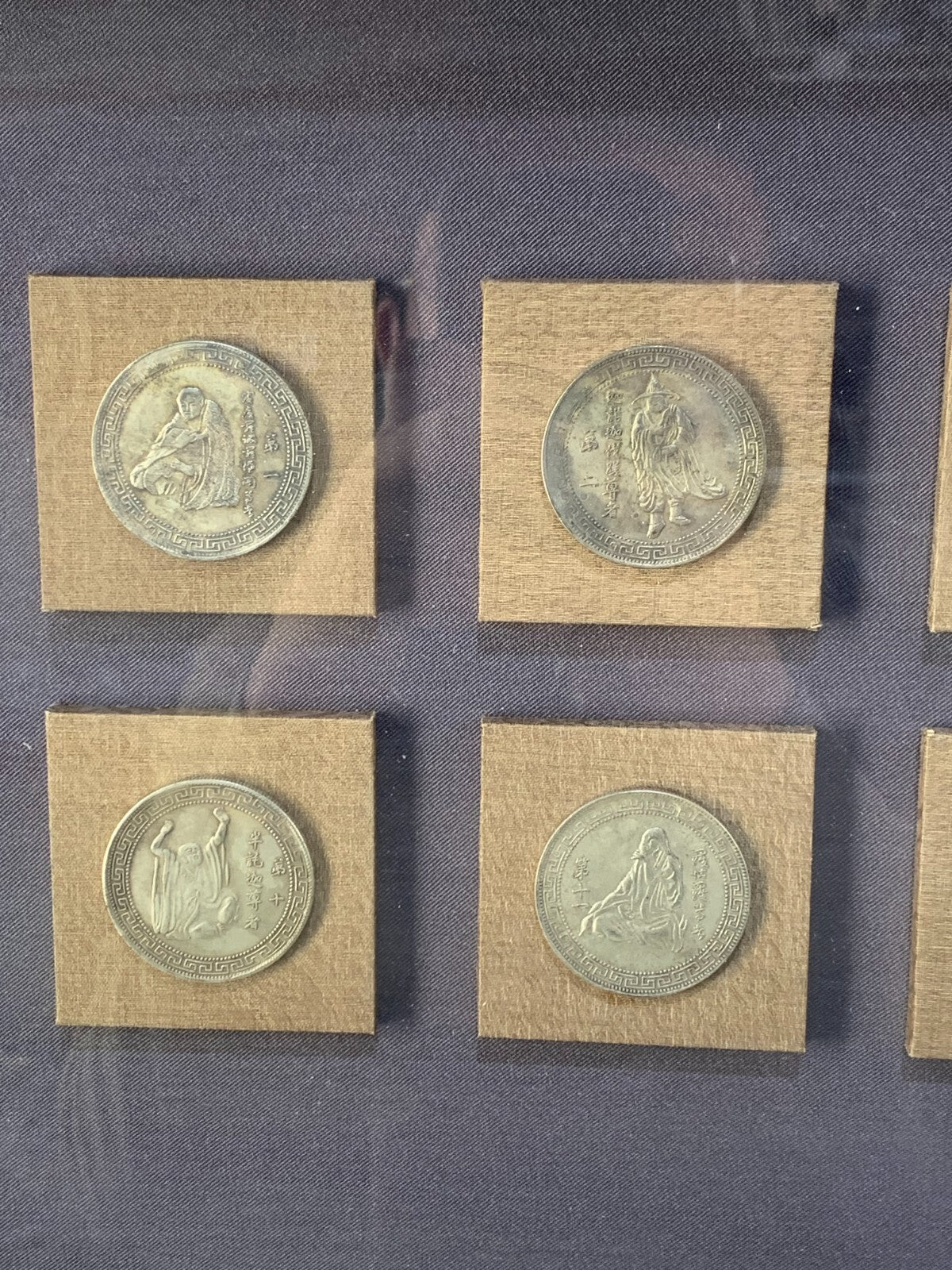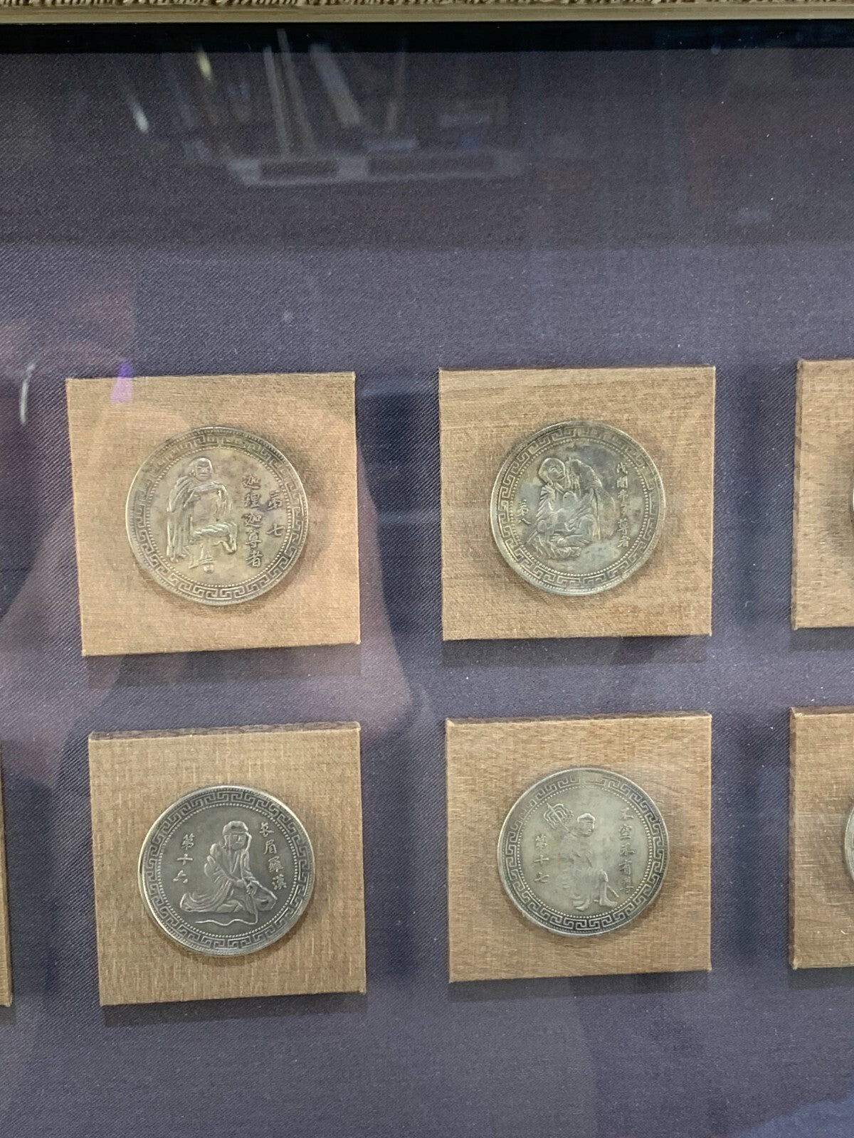 The product is a set of 18 antique Buddhist Arhats coins originating from Southeast Asia. These coins are considered amulets in Southeast Asian culture and are intricately designed with Buddhist symbolism. They are displayed in a frame, making them a unique and visually appealing collectible item for those interested in Asian antiques. The coins hold historical and cultural significance, showcasing the artistry and beliefs of the region.