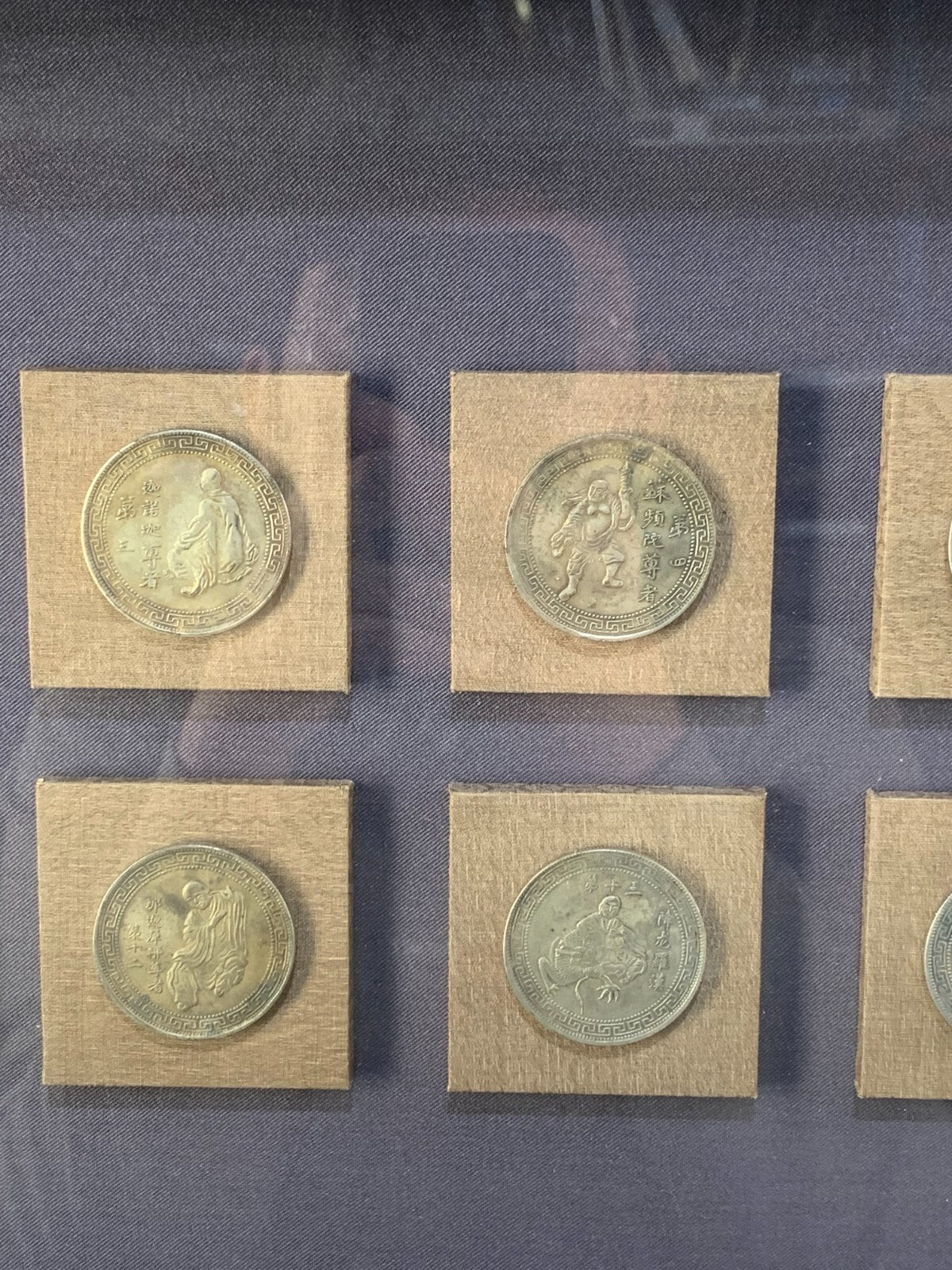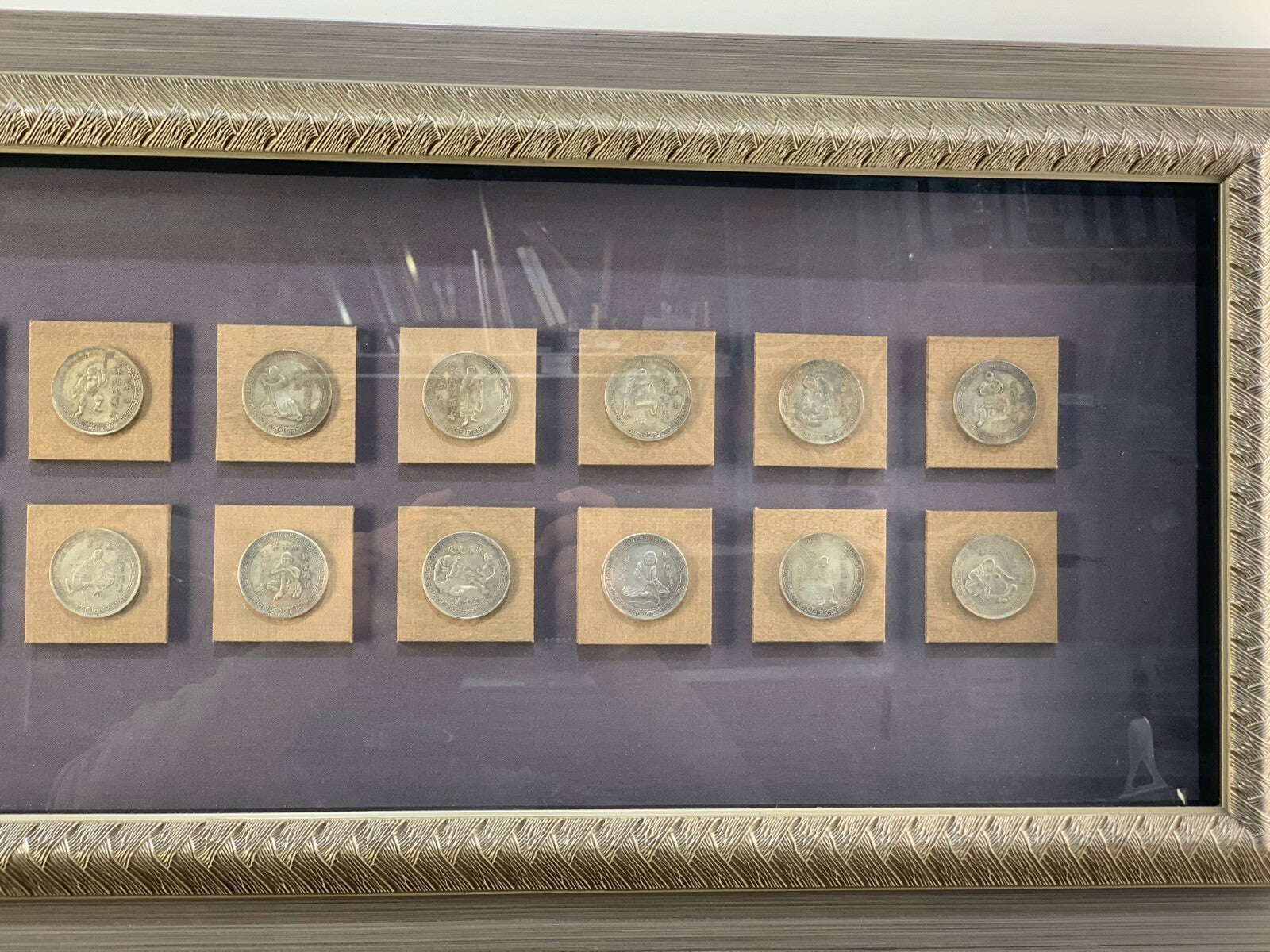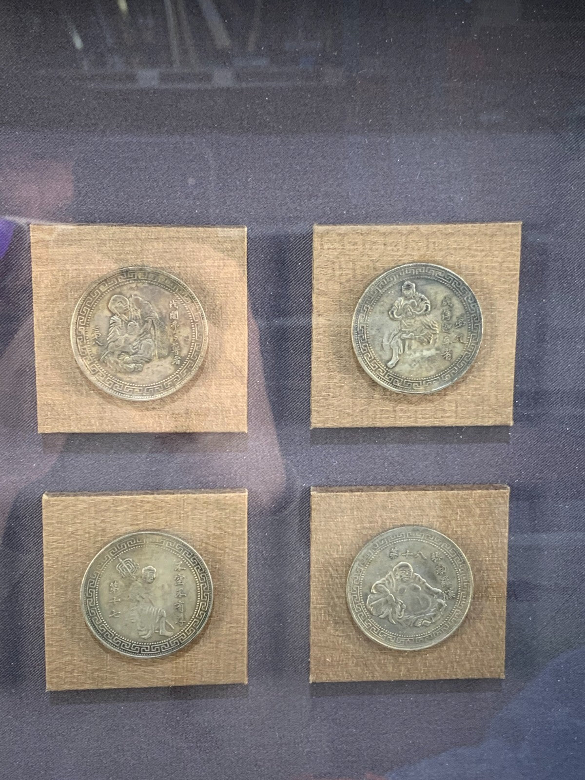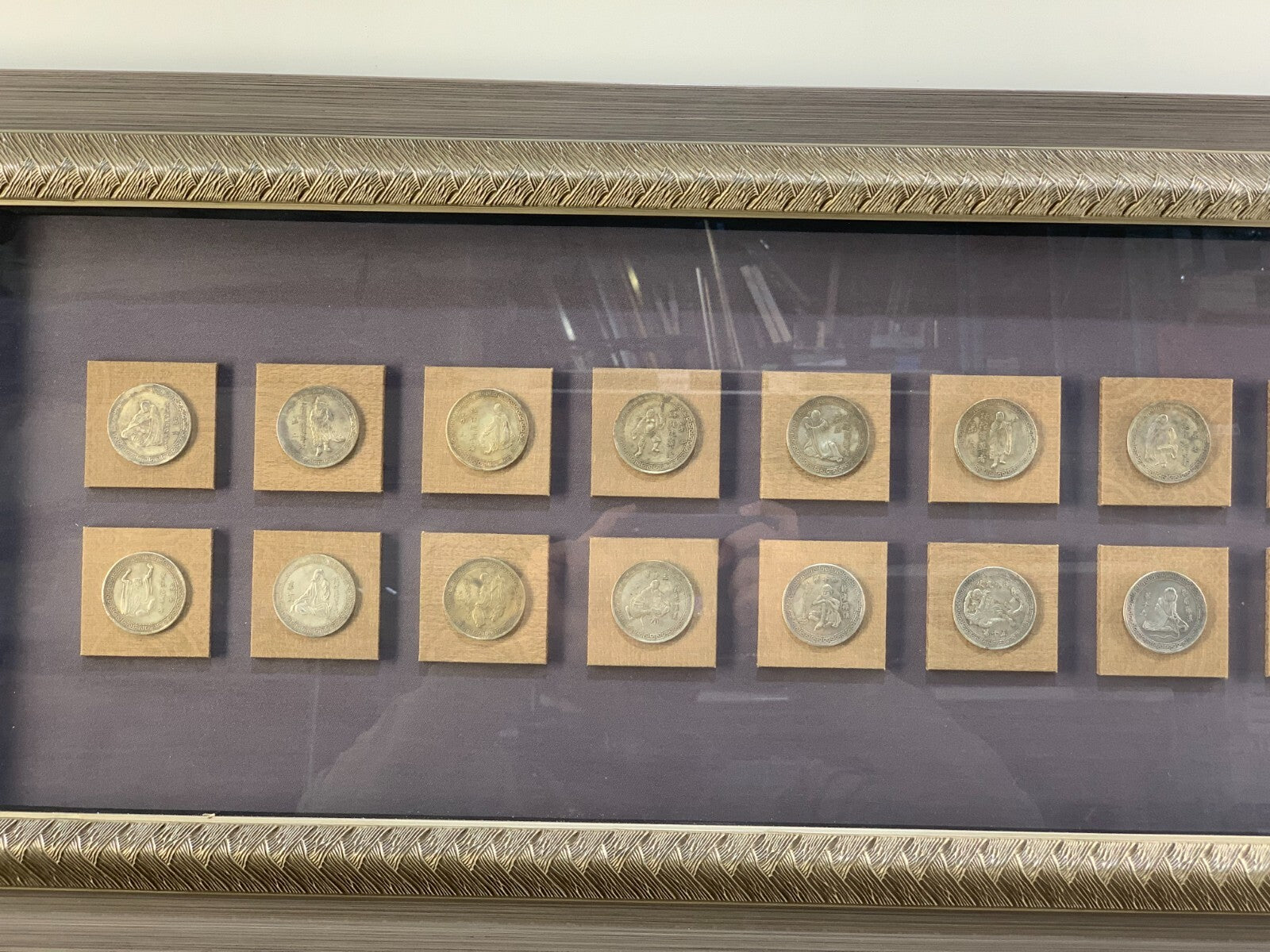 The product is a set of 18 antique Buddhist Arhats coins originating from Southeast Asia. These coins are considered amulets in Southeast Asian culture and are intricately designed with Buddhist symbolism. They are displayed in a frame, making them a unique and visually appealing collectible item for those interested in Asian antiques. The coins hold historical and cultural significance, showcasing the artistry and beliefs of the region.