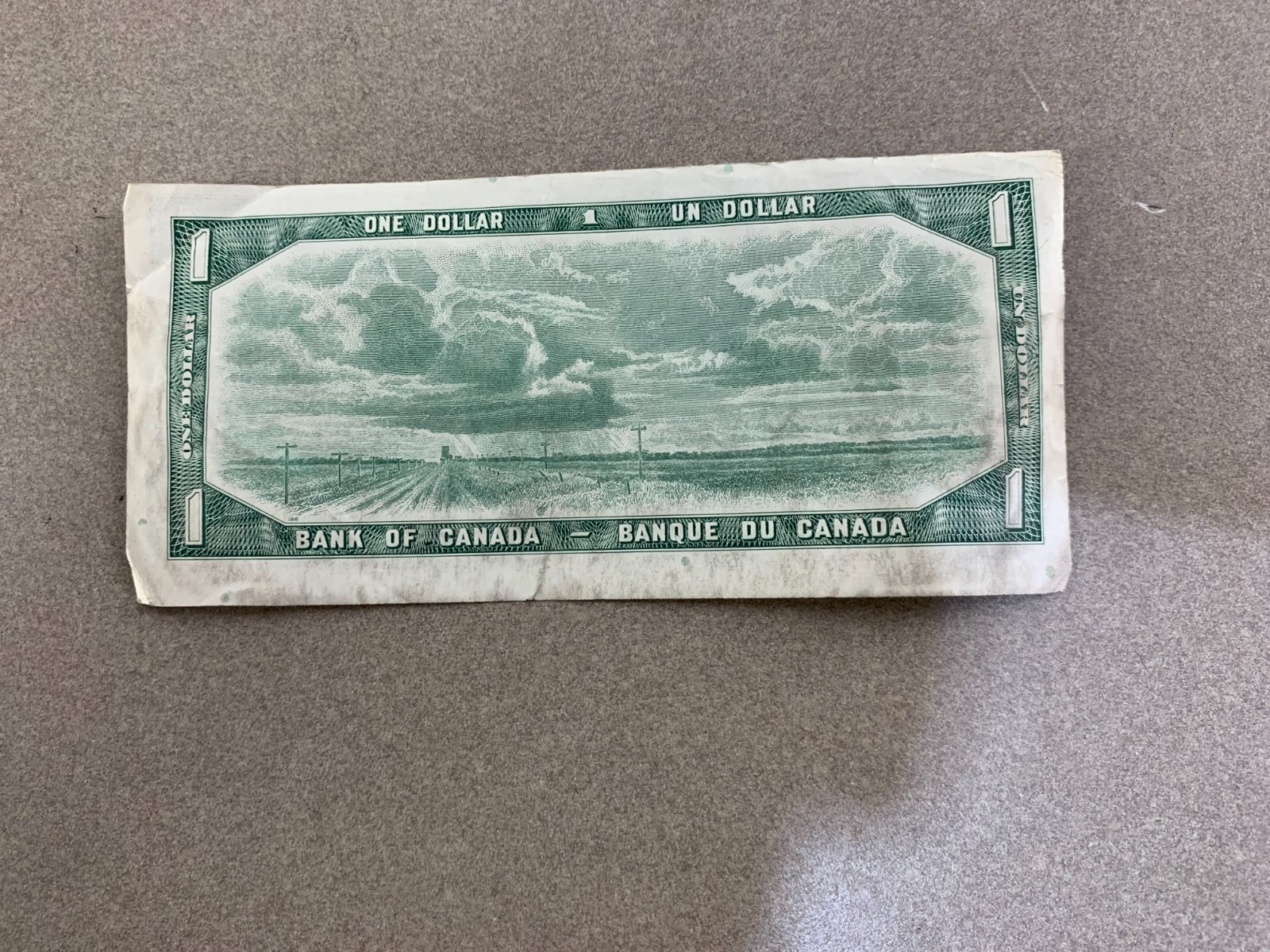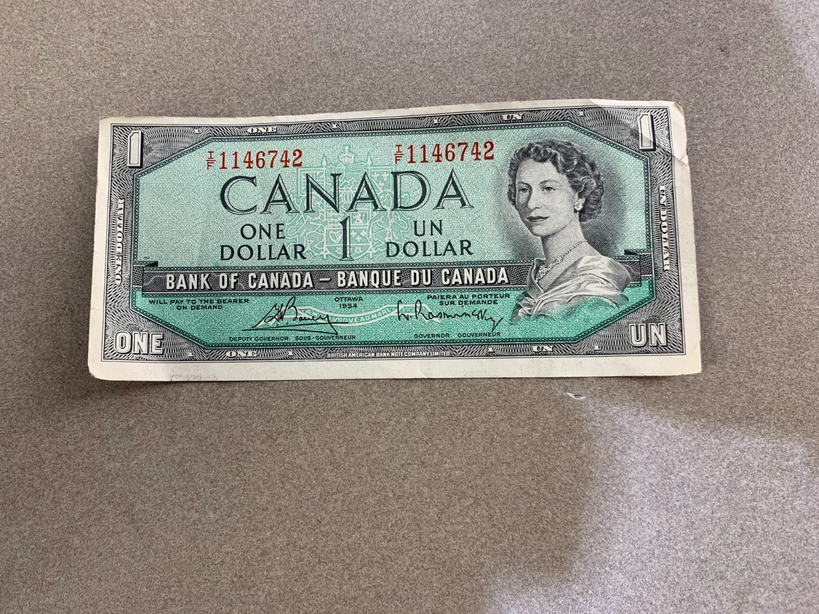 The product is a 1954 Bank of Canada $1 note with the serial number I/F1146742. This banknote is a collectible item from Canada and falls under the category of paper money. It is a piece of history from the mid-20th century, showcasing the design and currency of that era. The note is ungraded, making it a unique addition to any collection of Canadian banknotes or world paper money.