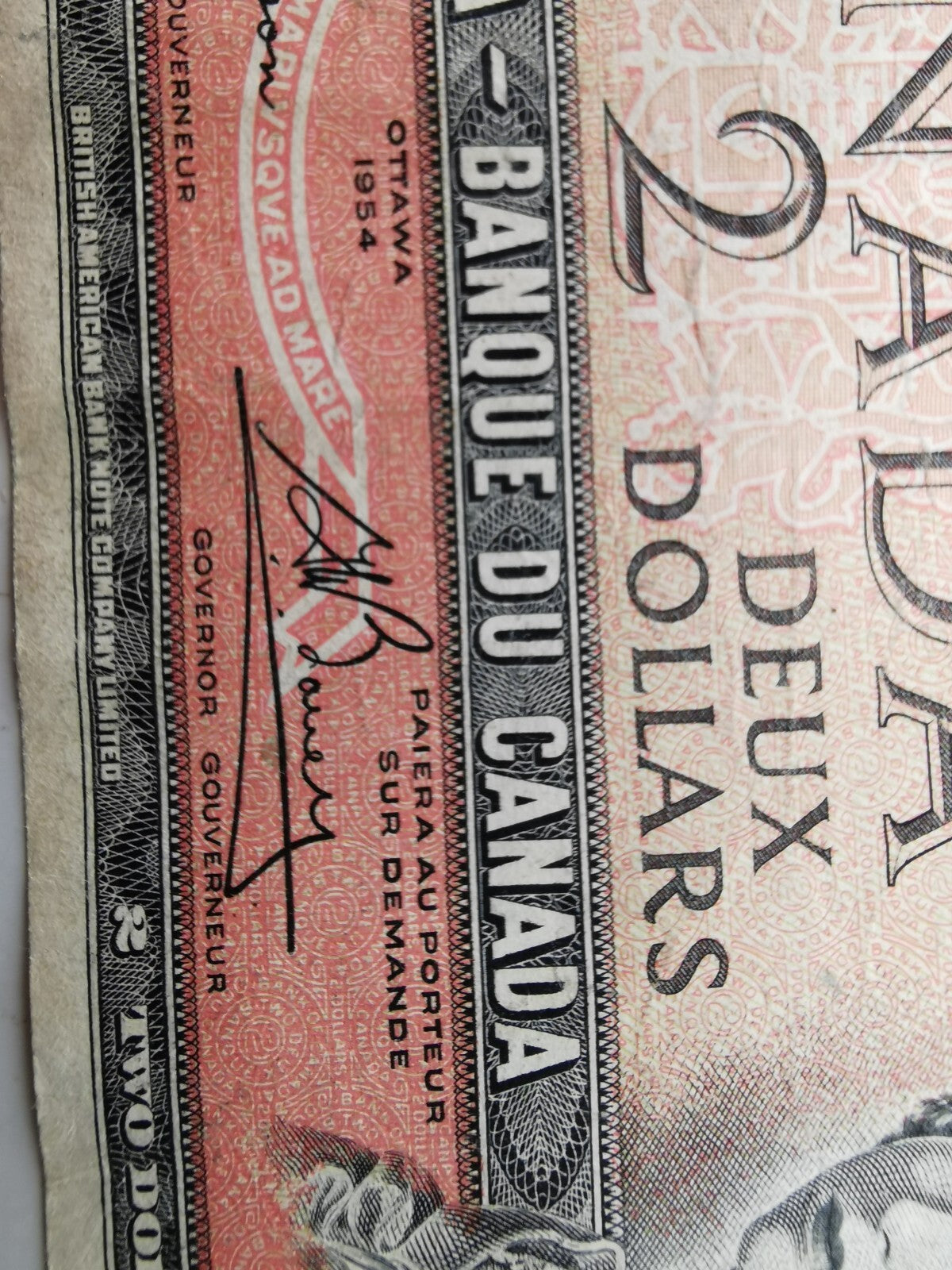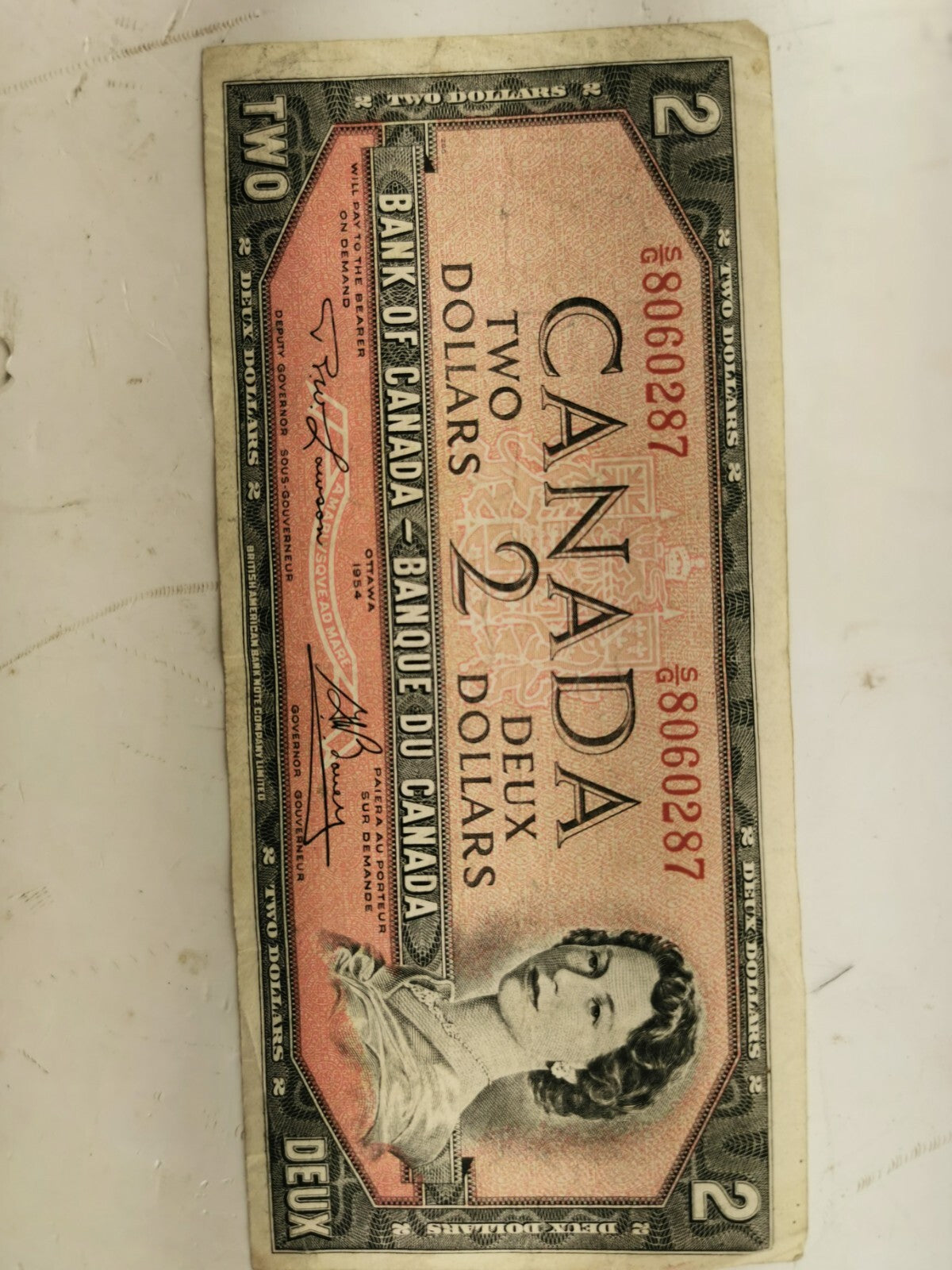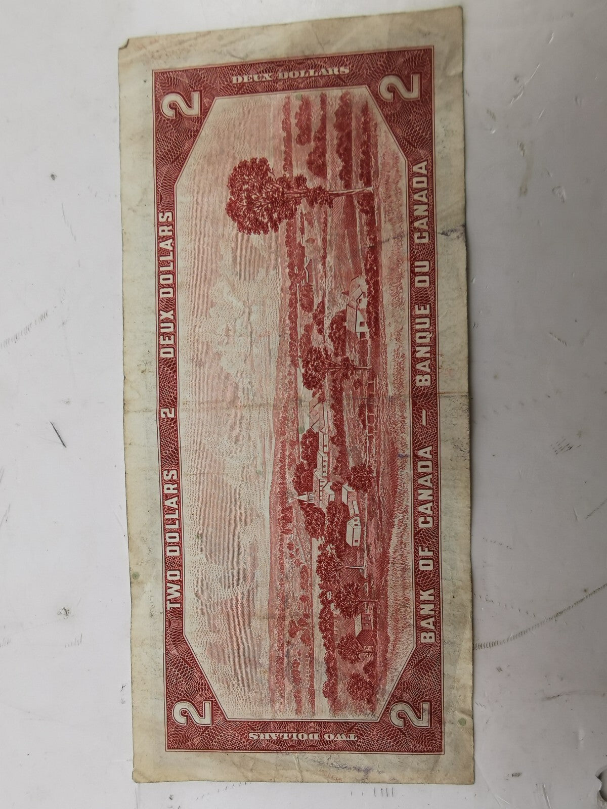This 1954 Canadian 2 dollar bill is a circulated piece of history. Its age and wear reflect its earlier usage, but it still retains its original design and integrity. The bill features the portrait of Queen Elizabeth II on the front and a depiction of Canada's national symbol, the maple leaf, on the back. The bill is a great addition to any collection of Canadian currency, especially for those interested in the history behind it. Its unique attributes, such as its year of issue and circulated state, make it a valuable piece for collectors and history buffs alike. Add this 1954 Canadian 2 dollar bill to your collection today.