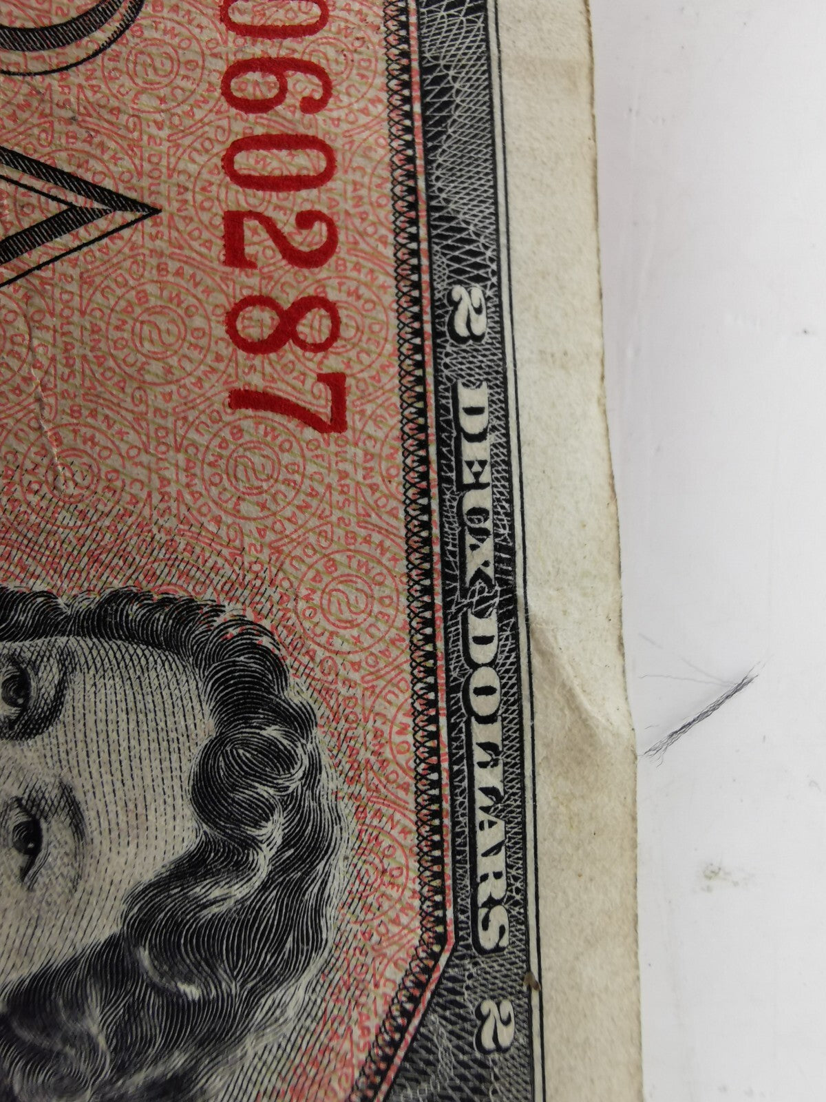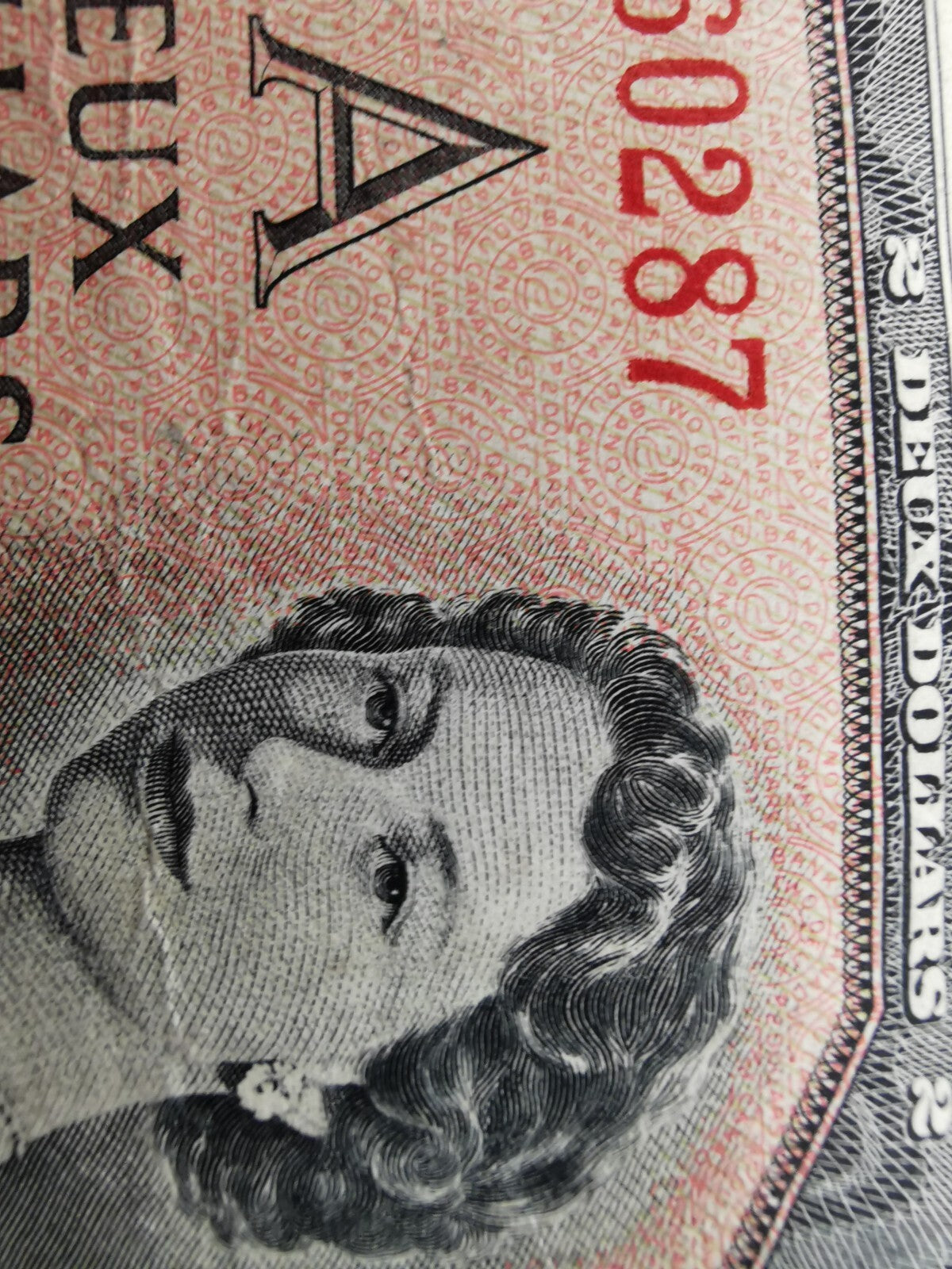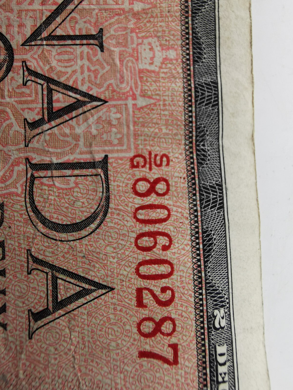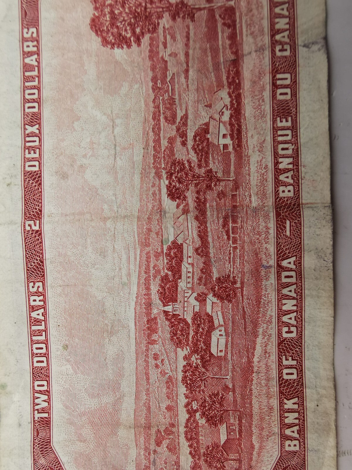 This 1954 Canadian 2 dollar bill is a circulated piece of history. Its age and wear reflect its earlier usage, but it still retains its original design and integrity. The bill features the portrait of Queen Elizabeth II on the front and a depiction of Canada's national symbol, the maple leaf, on the back. The bill is a great addition to any collection of Canadian currency, especially for those interested in the history behind it. Its unique attributes, such as its year of issue and circulated state, make it a valuable piece for collectors and history buffs alike. Add this 1954 Canadian 2 dollar bill to your collection today.