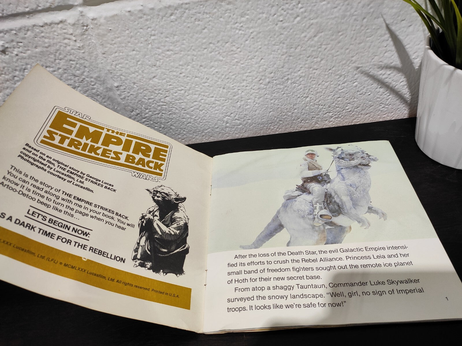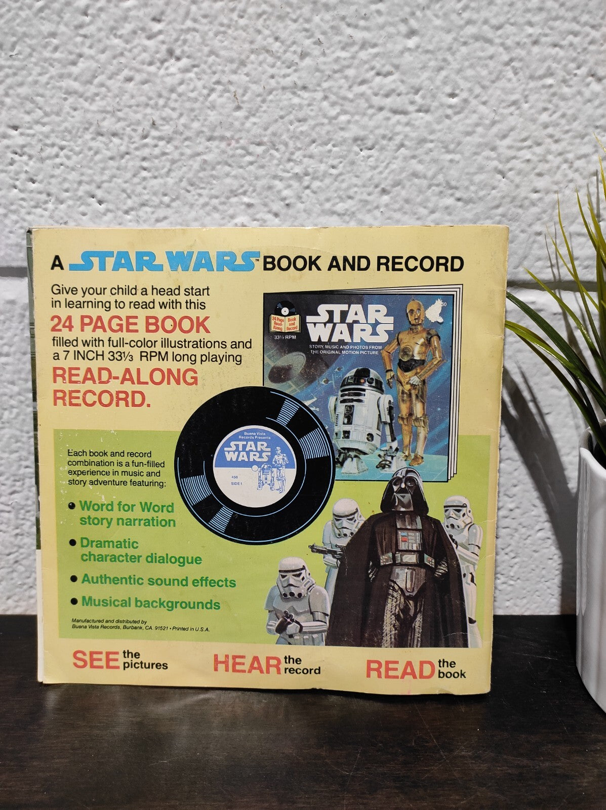 The 1980 Star Wars: The Empire Strikes Back 24-Page Read-Along Book and Record is a collectible storytelling set that brings the epic adventure of the iconic Star Wars sequel to life. Featuring a 24-page illustrated book and a vinyl record, this read-along experience allows fans to listen and follow along with dramatic narration, sound effects, and dialogue from the movie.