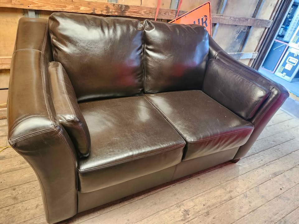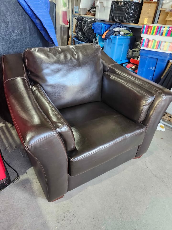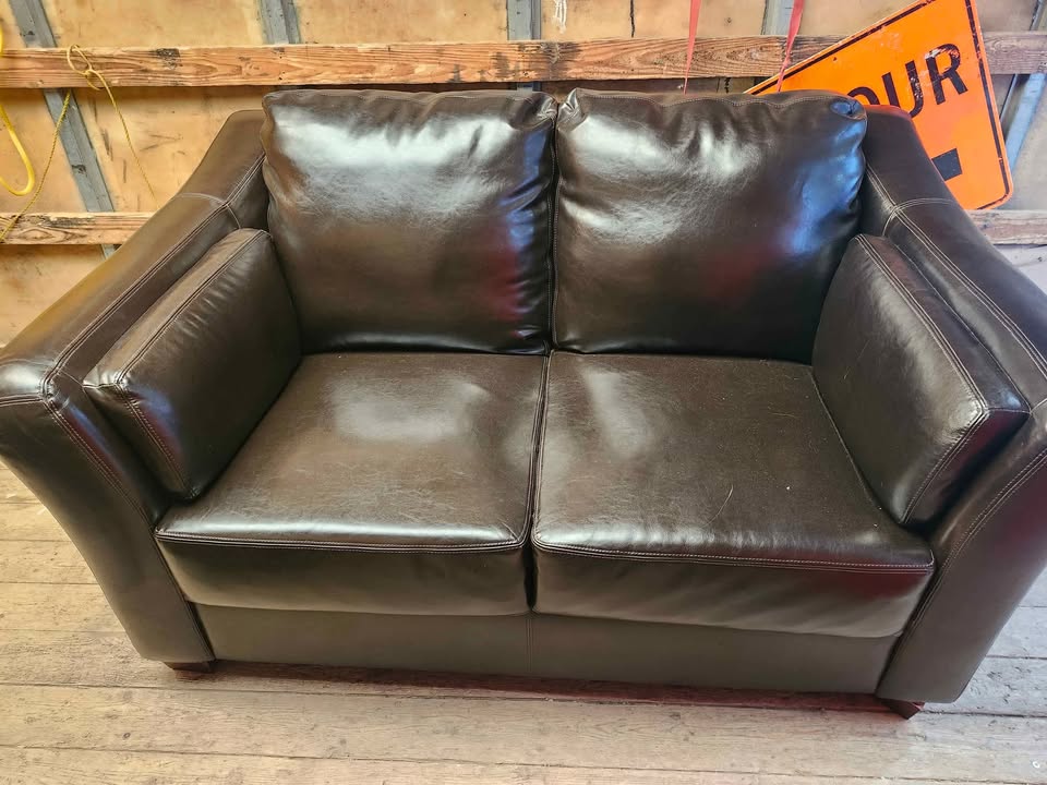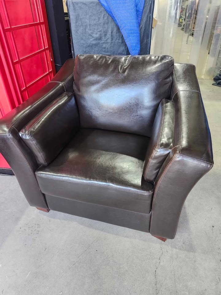 The set includes a sofa, loveseat and arm Chair. Overall they are all in great condition with very minimal wear from use. Just from our experience with sofas, they seem to be faux leather/Vinyl however we cannot be 100% sure as we cannot find any labels.