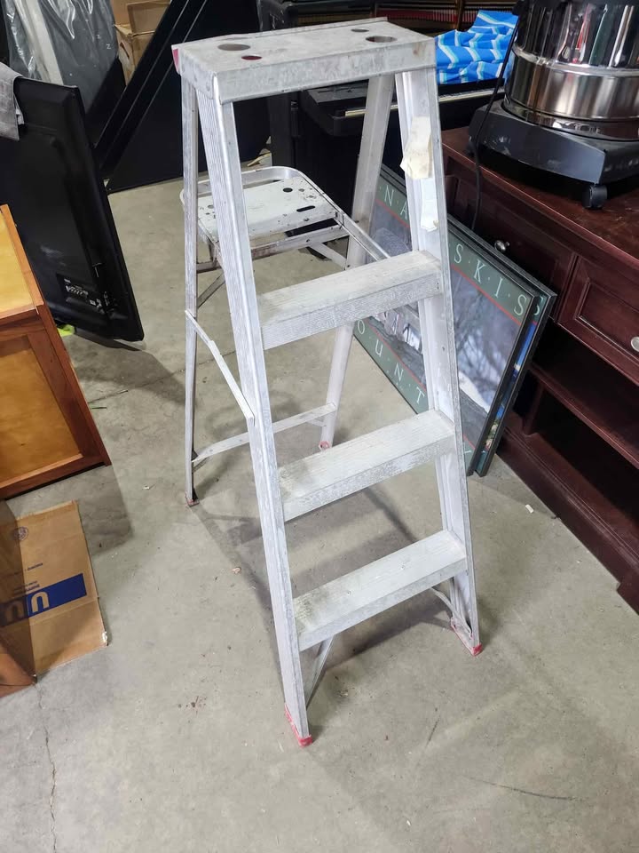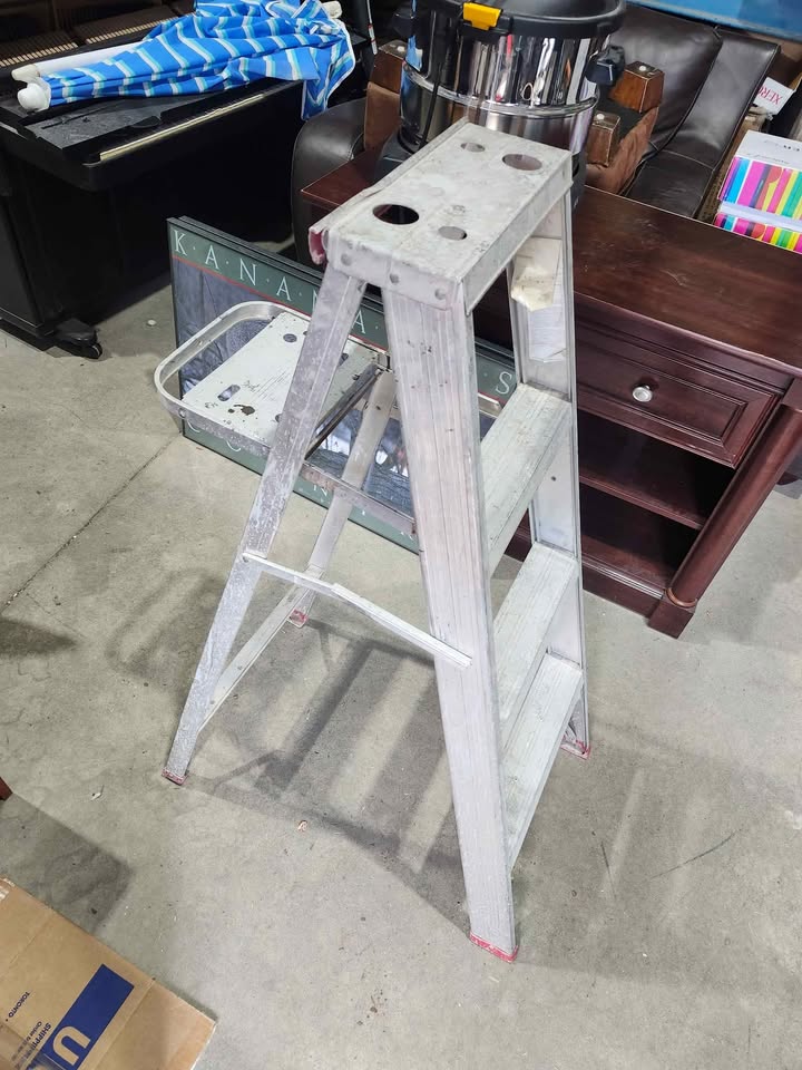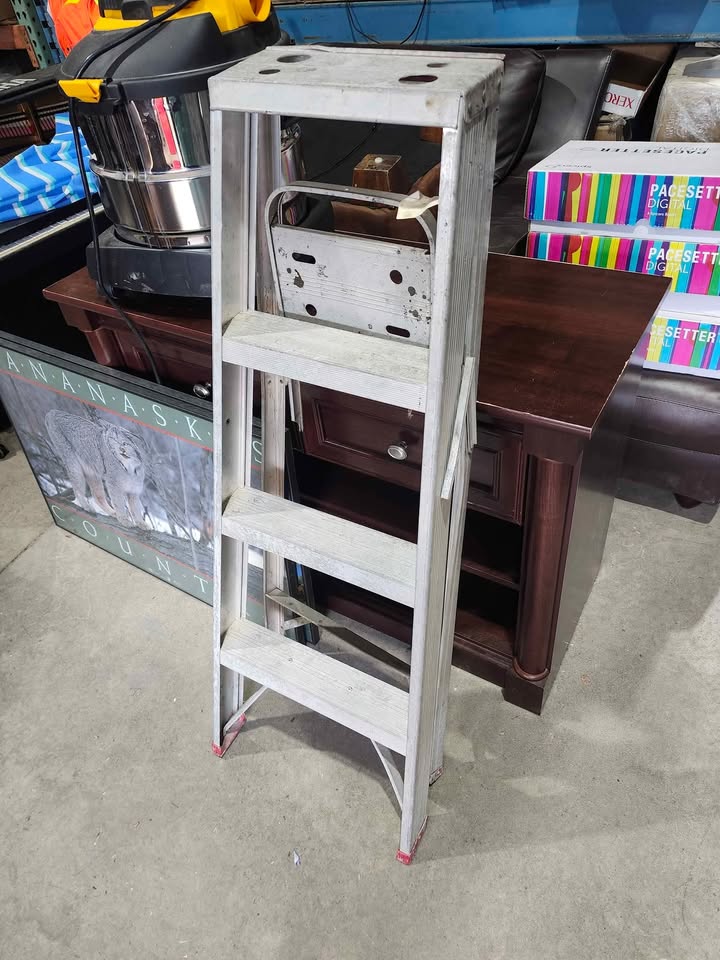 A three-step ladder. Made of aluminum. Has red caps on the feet. With a small tray on the side, a great place to hold your tools while working on a project. In great condition, just a little dirty from use. 6215 3rd St SE, Unit C11 - Rebound Centre Daily 10 AM – 5 PM Local pickup/Delivery available