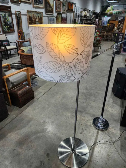 Add a touch of modern elegance to your living space with this stylish floor lamp, standing approximately 58" tall. The lamp features a sleek silver finish and a decorative leaf-patterned shade, providing a warm and inviting glow. This item is used, but is in very good condition.