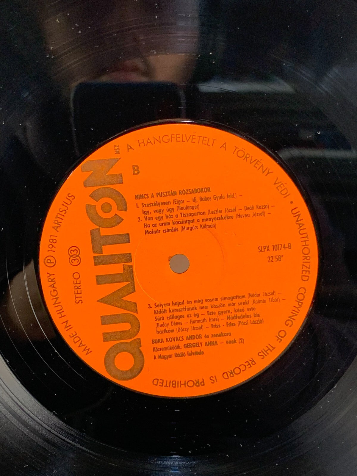 The product is a vinyl LP titled "Nincs a Puszta Rózsa Bokor" by Hungarian artist Andor Bura Kovács and his Gipsy Band. The record features Hungarian songs performed by the band, showcasing traditional and authentic music from the region. This vinyl LP offers a nostalgic and authentic listening experience for music enthusiasts who appreciate classic recordings and the unique sound of Hungarian folk music.