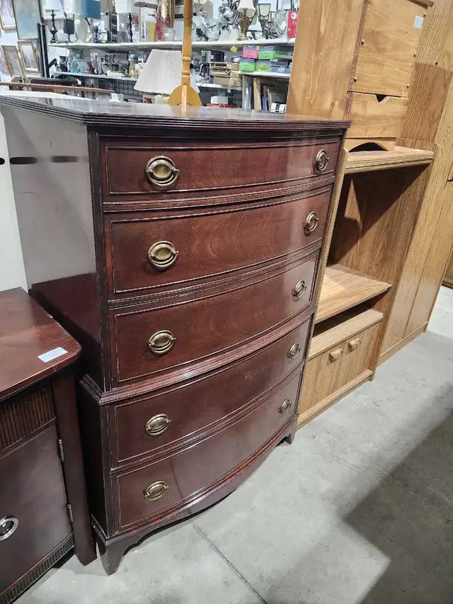 This used antique chest of drawers features a beautiful, classic design perfect for adding character to any room. Solidly built with dovetail drawers and made here in Canada.