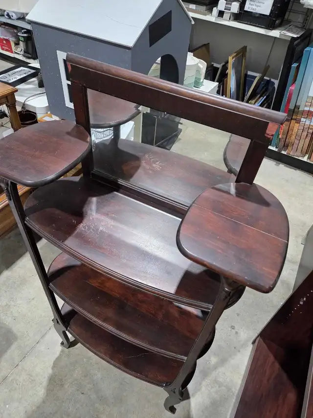 Elevate your greenery with this charming used antique plant stand, featuring four tiers of shelving to showcase your favourite plants and decor. This plant stand shows signs of wear consistent with its age, adding to its authentic vintage appeal.