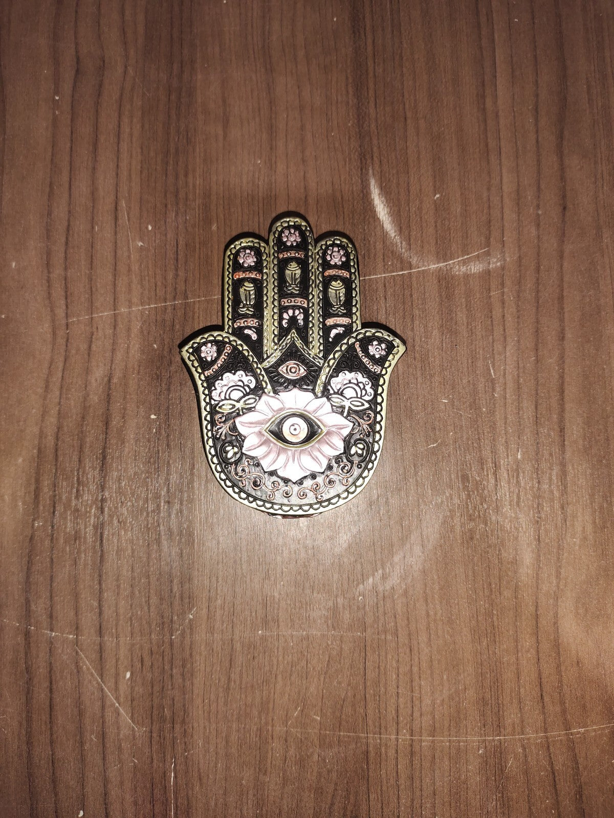 This elegant trinket box features a striking black and gold Hamsa design, symbolizing protection and good fortune. Crafted from durable materials, it offers both functionality and a touch of spiritual charm to any space.