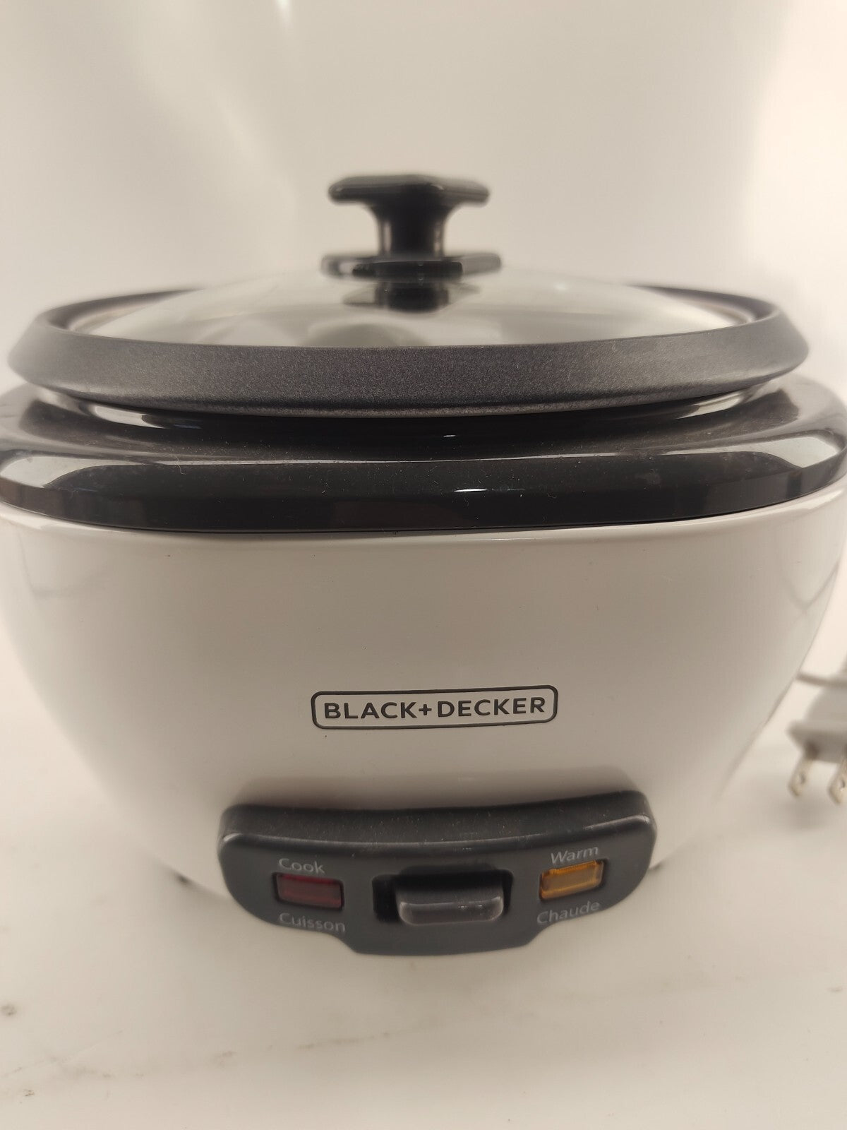 The BLACK+DECKER 3-Cup Electric Rice Cooker in white is a compact and convenient appliance designed for preparing rice and other steamed dishes.