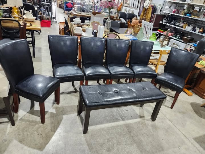 Six black genuine leather (leather hide) dining chairs with dark brown legs. Matching bench included. Seats are cushioned. good as new condition. Visit Rebound Centre Thrift Store 6215 3rd St SE, Unit C11 Open daily 10 AM – 5 PM Local pickup available Condition Like new