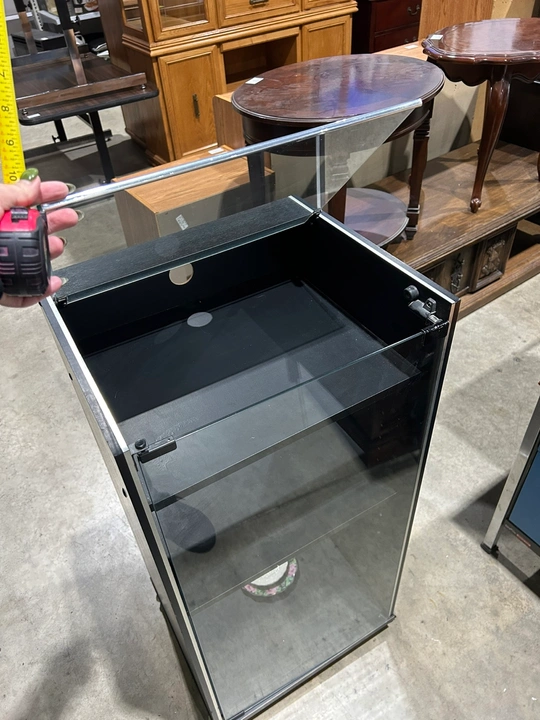 Three-shelf display cabinet. Black frame and glass. Features a hinged glass top. Small wheels for mobility.