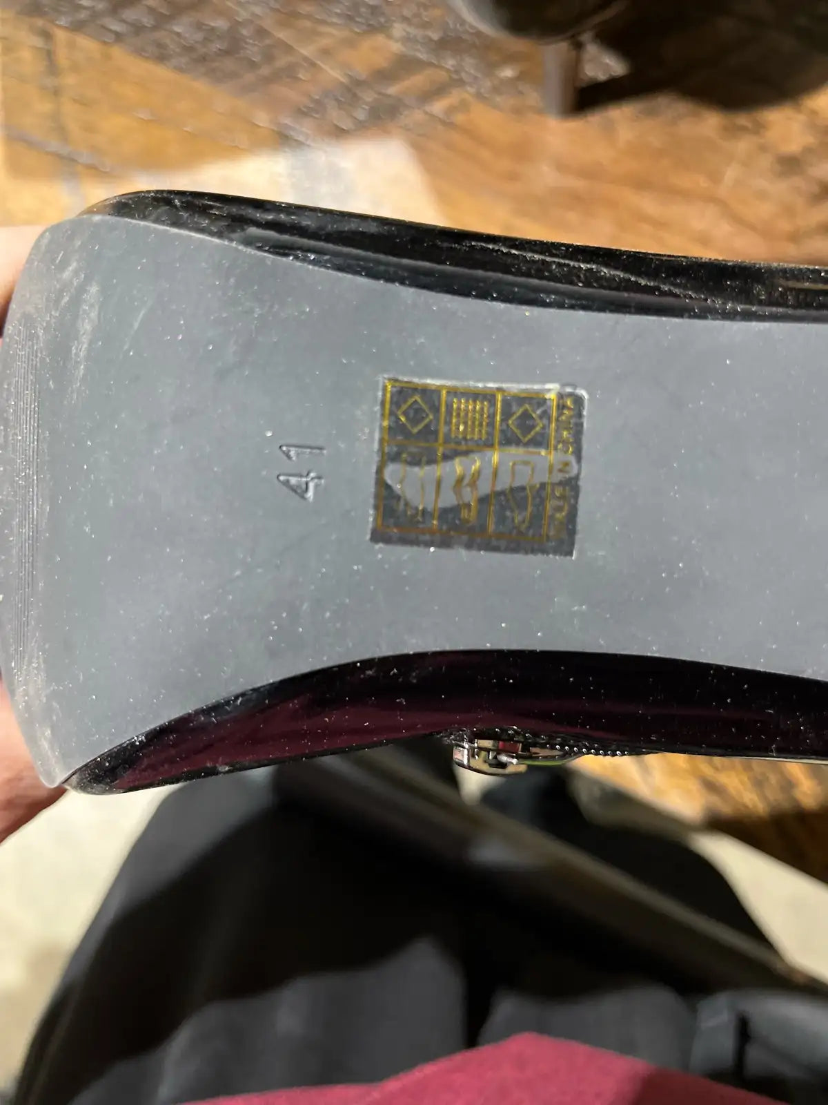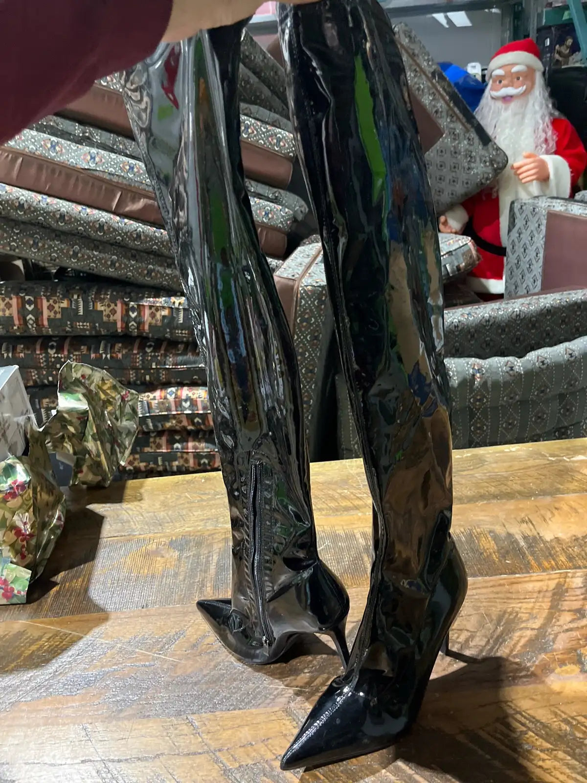 Step out in style with these striking black, size 41 (approximately size 10 US) stiletto heeled, over-the-knee boots, perfect for making a bold fashion statement. Please note, these boots have been previously enjoyed and show some signs of wear, adding character to their edgy appeal. * Size: 41 (US 10) * Colour: Black * Style: Over-the-knee * Heel Type: Stiletto
