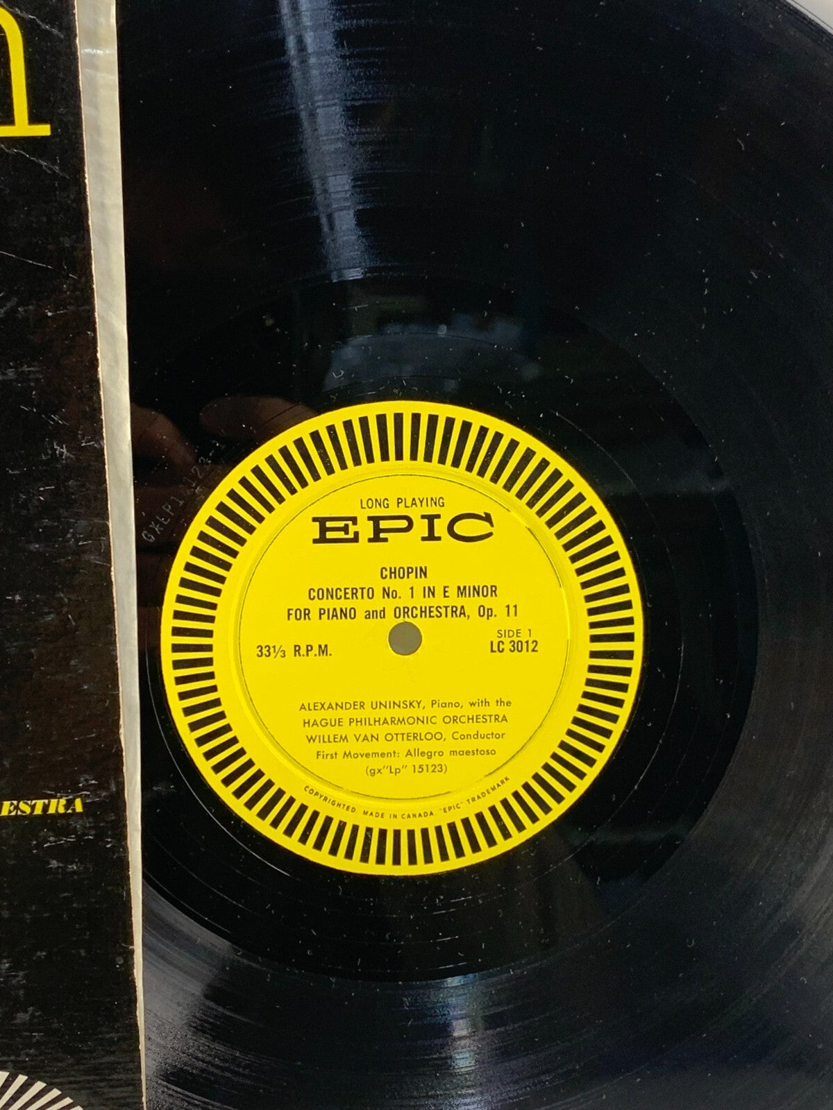 Immerse yourself in the timeless beauty of Chopin's Concerto No. 1 in E Minor for Piano and Orchestra, Op. 11, brought to life on this classic LP. The piece is rendered by the esteemed Alexander Uninsky, accompanied by the Hague Philharmonic under the direction of Willem Van Otterloo, capturing the essence of this romantic masterpiece with rich, warm sonality. This record, pressed on a 12" black vinyl, is a testament to the enduring allure of classical music. The Epic label ensures a high-quality audio experience, allowing listeners to fully appreciate the intricate melodies and profound emotions expressed in this concert. A true collectible for enthusiasts of the genre, this LP promises a listening experience that is both profound and captivating.