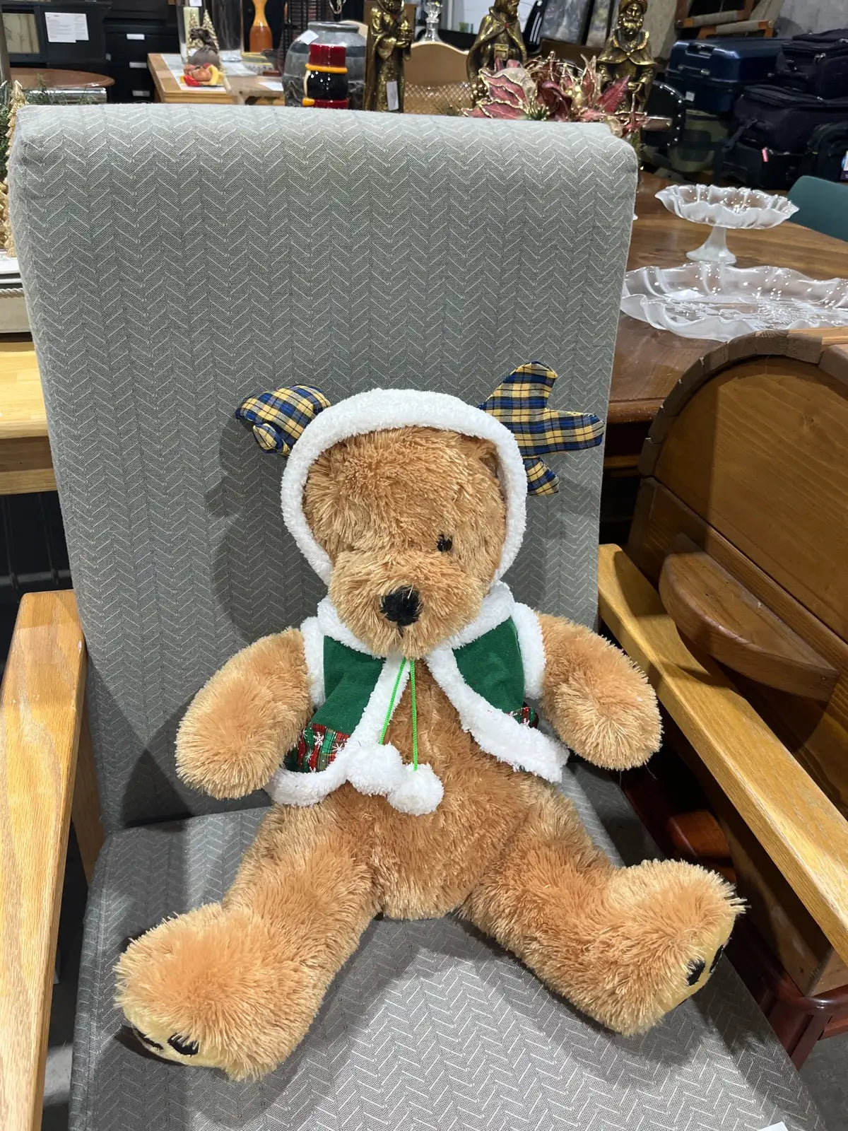 This charming, gently used Christmas teddy bear stands approximately 50 cm tall, making it a delightful addition to your holiday décor. Dressed in a festive green and white vest and a reindeer-themed hood, it's ready to spread seasonal cheer. This adorable bear is in good condition and looking for a new home to bring joy to. The price is $20+5%GST 6215 3rd St SE, Unit C11 - Rebound Centre Daily 10AM - 5PM