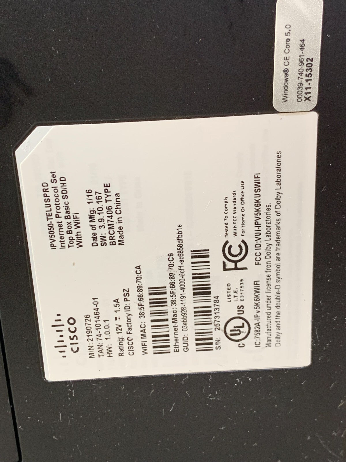 Cisco Technicolor IPV5050 HD Set Top Box With power cord and remote.