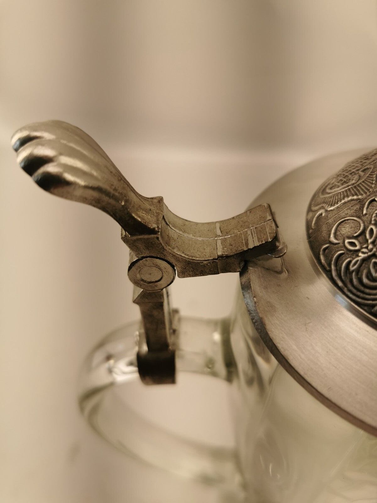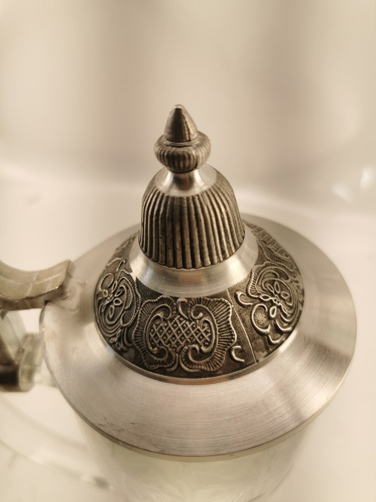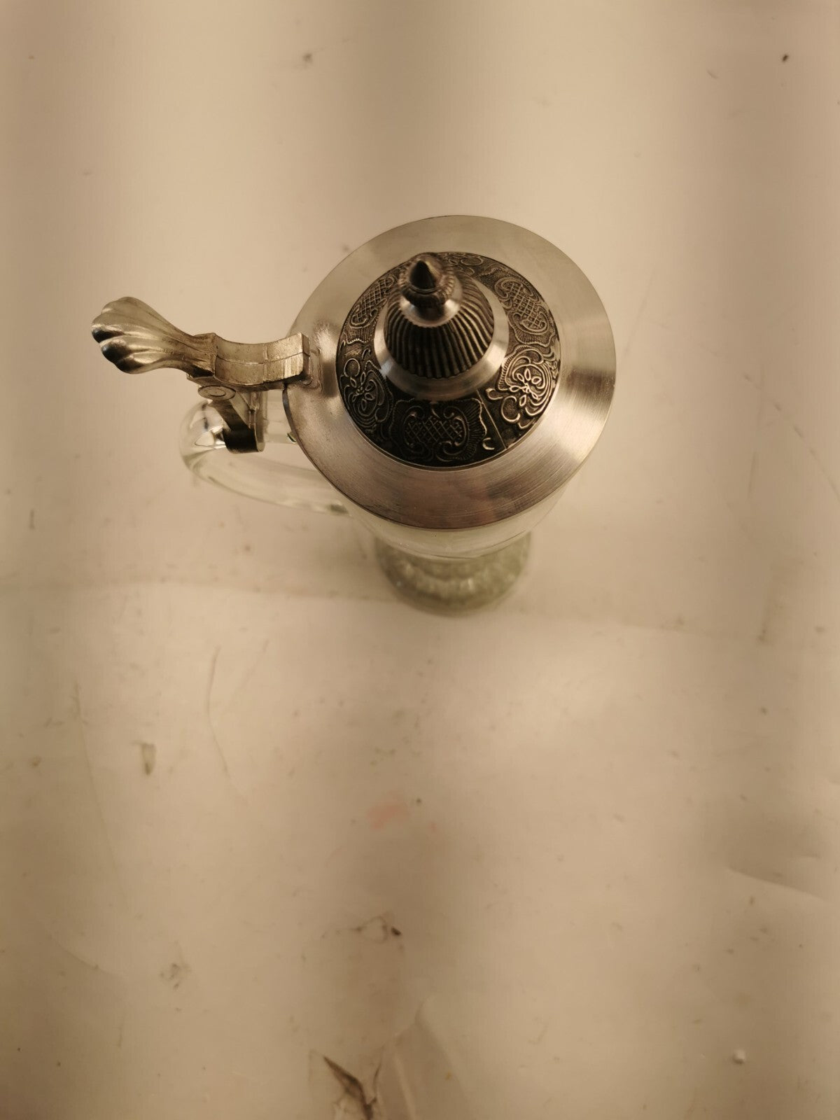 This unique cut glass beer stein is a must-have for any collector of breweriana. Made in Germany, this lidded stein is perfect for enjoying your favorite brew or displaying in your collection. The intricate design and quality construction make it a great addition to any barware collection. The stein is perfect for those who appreciate the finer things in life. The lid helps to keep your beer at the optimal temperature and the cut glass design adds a touch of elegance to your table. This stein is ideal for anyone who loves collecting unique and high-quality items.
