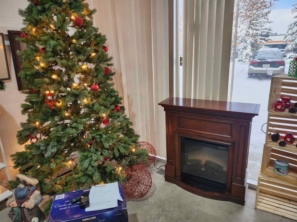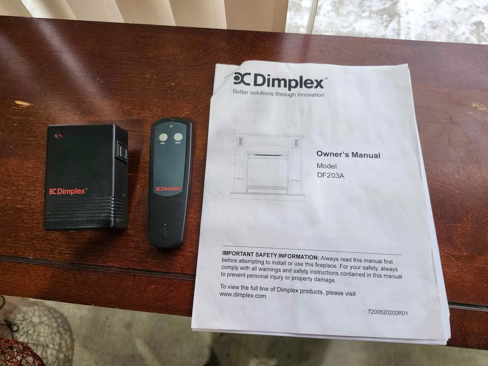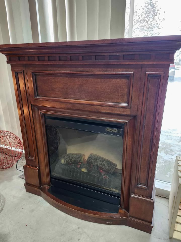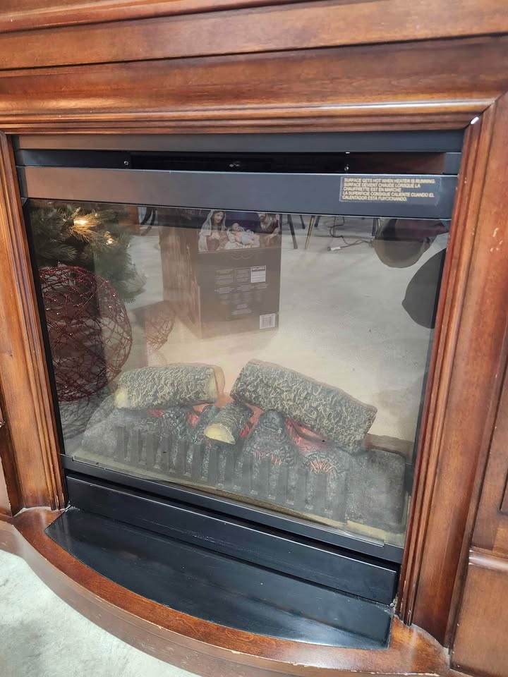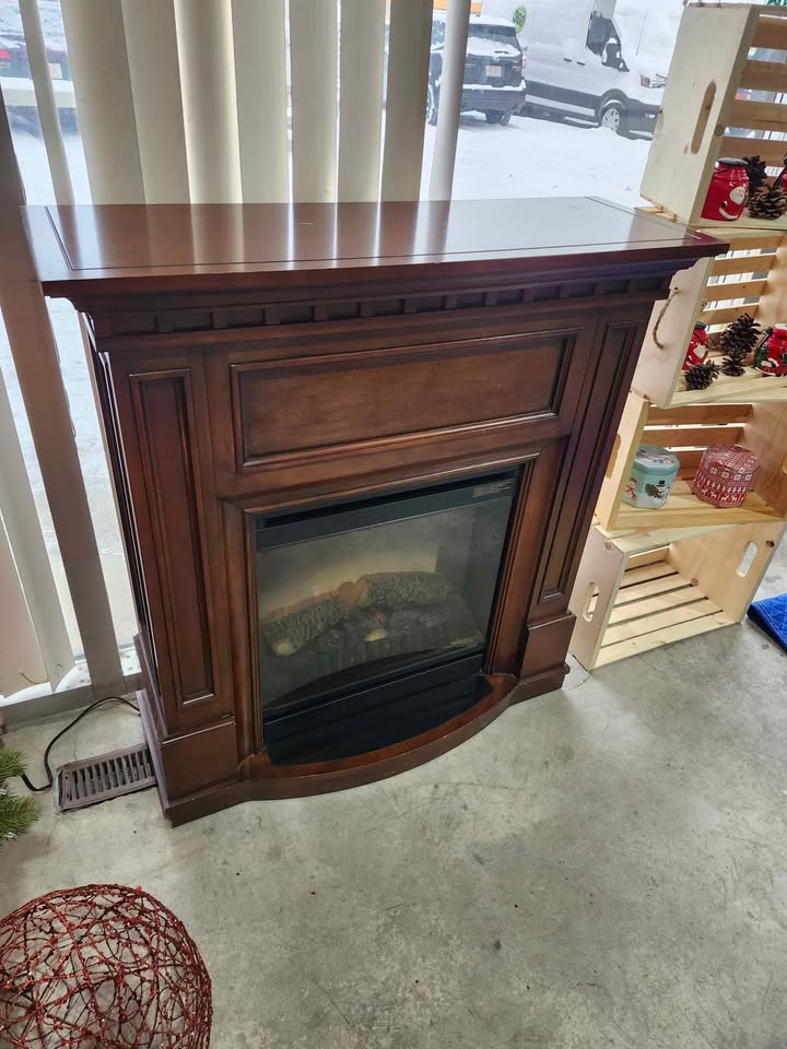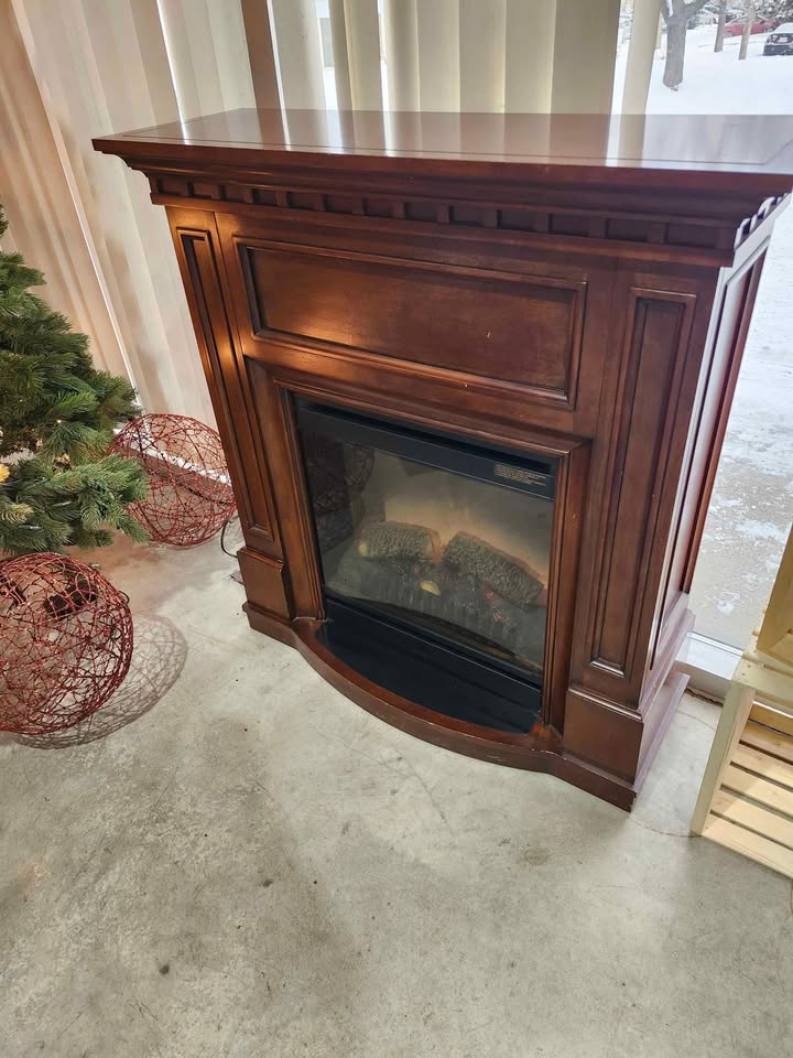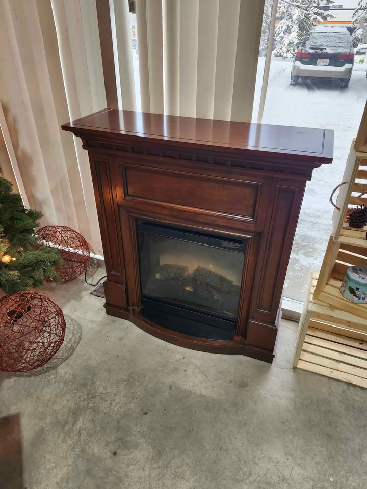 Overall in excellent working condition. There's a few slight marks on the top consistent with were ornaments etc have been placed but very minor. Comes with a remote, has a flame setting along with adjustable heat. Measures at 38" wide, 13" deep and 40" tall.