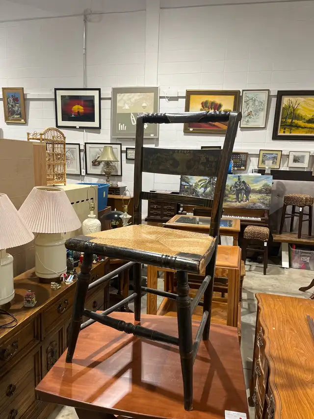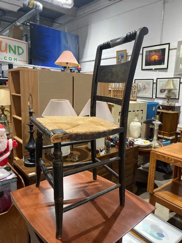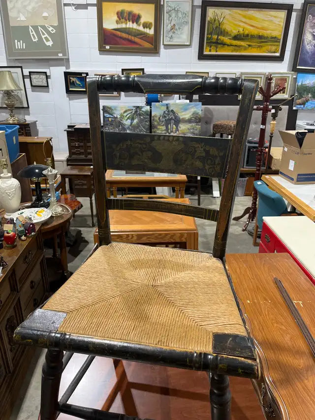 This is an early 20th-century antique chair featuring a Hitchcock style with stenciled rush. As a used item, it carries a unique charm and character that only time can bestow, making it a distinctive addition to any home. This antique chair exudes vintage sophistication. Imagine it nestled in a cozy reading nook or enhancing your dining area with its classic appeal. The price is $175+5%GST 6215 3rd St SE, Unit C11 - Rebound Centre Daily 10AM - 5PM