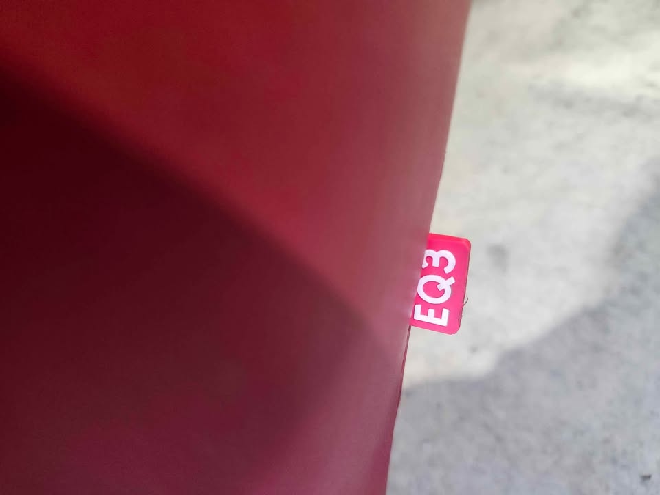 Overall in great condition, there's a few minor blemishes here and there from use but nothing drastic. Really nice Modern design, very comfortable and from a pet/smoke free home. Made of 100% genuine leather as are all of the EQ3 items. It's red in color, however not so much a striking red but a bit darker.