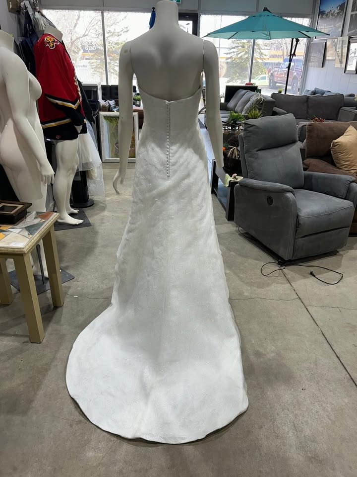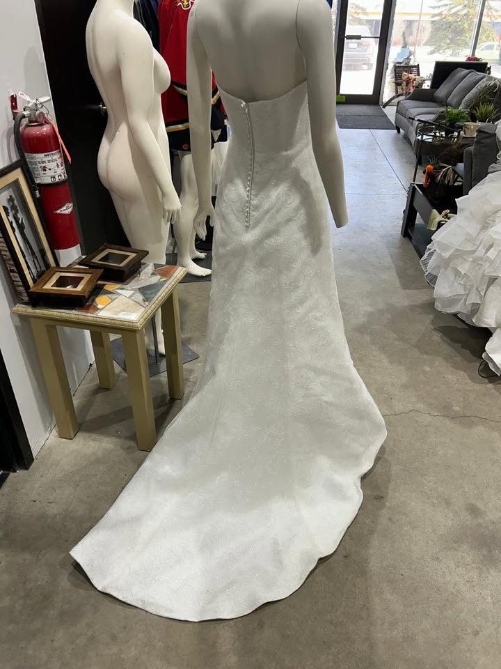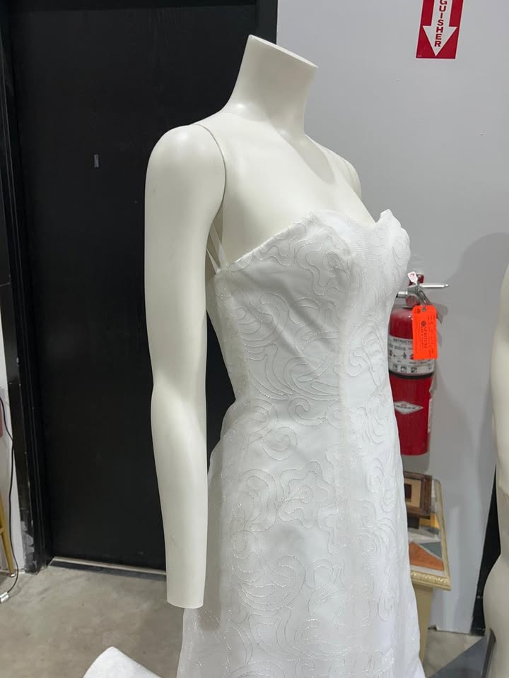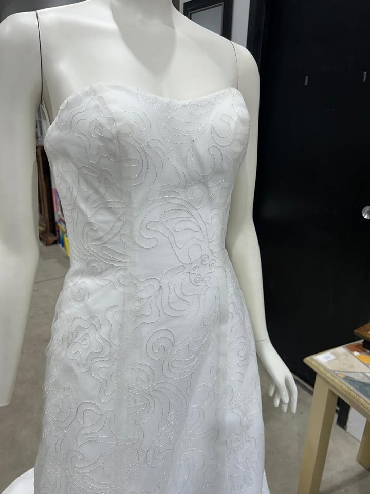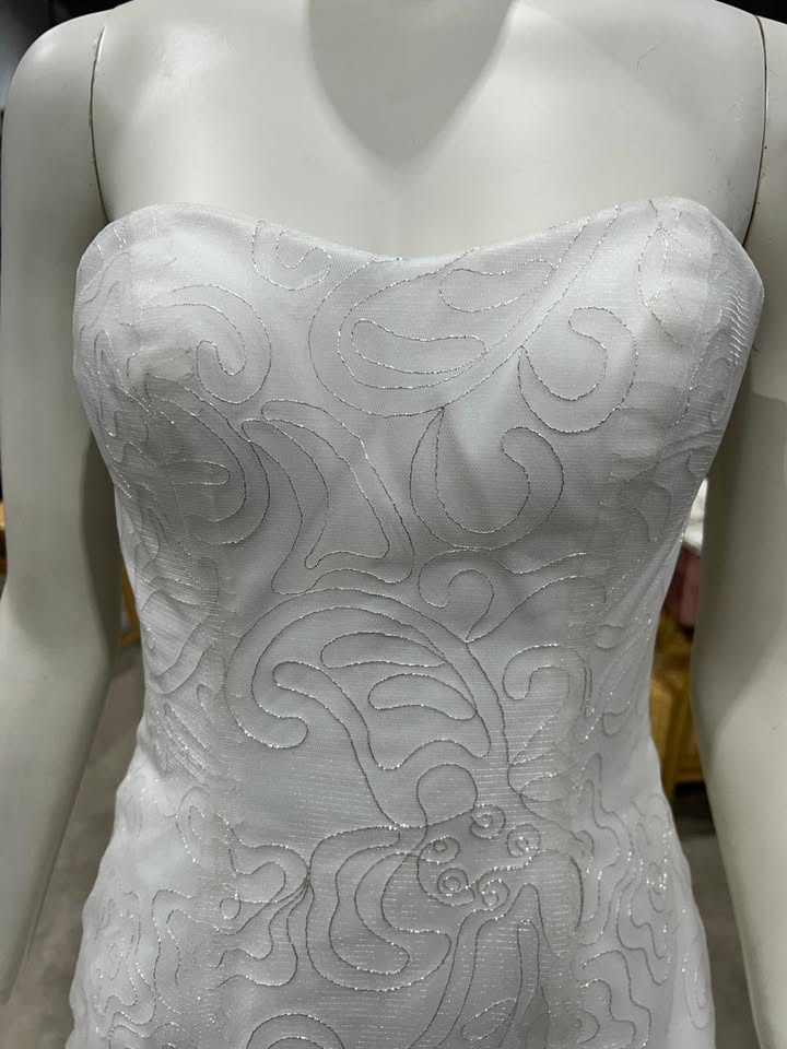 Ethereal Dream Wedding Dress - Size S - a strapless, floor-length white gown. It features a sweetheart neckline and a subtle, embroidered or textured pattern throughout the fabric. The dress has a fitted bodice that flows into a gently flared skirt, creating a classic A-line silhouette.
