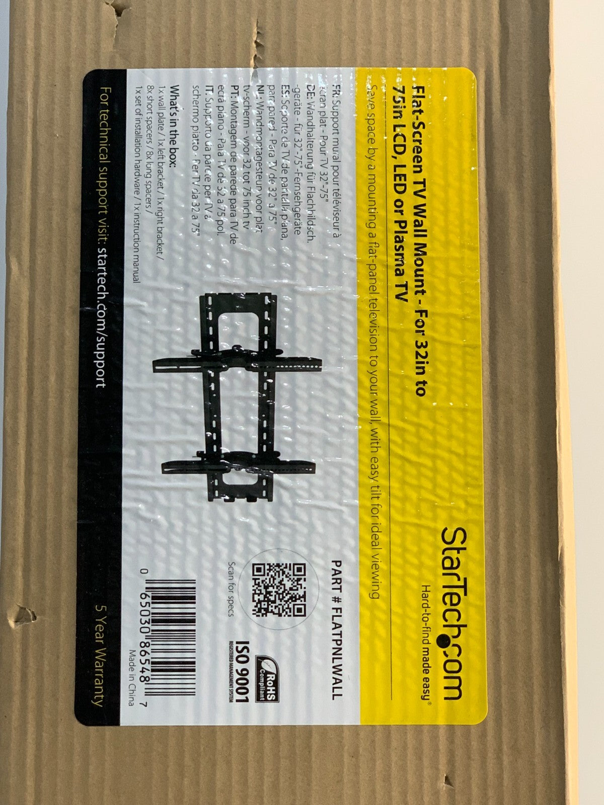 Elevate your viewing experience with the StarTech.com Flat-Screen TV Wall Mount, model number FLATPNLWALL. Designed to accommodate a wide range of TV sizes from 32 inches up to 75 inches, this wall mount is versatile and ensures a perfect fit for your LCD, LED, or Plasma television. The mount is crafted for ease of use and durability, offering a sleek design that seamlessly integrates with your home entertainment setup. With its sturdy construction and simple installation process, you can effortlessly position your TV for an optimal viewing angle and enjoy a clutter-free space.