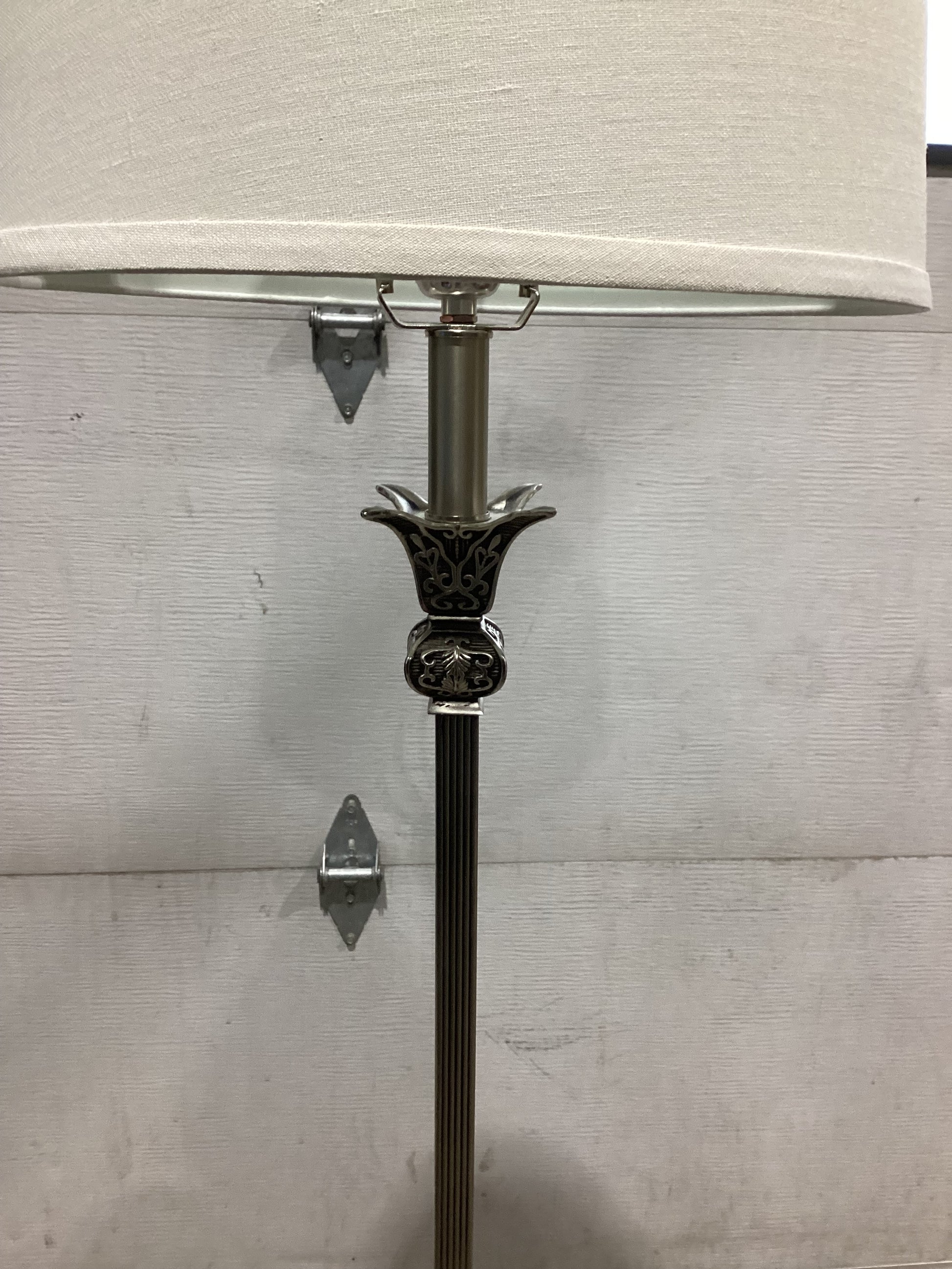 Here's a floor lamp with a white shade. It has a decorative design on the base and stem. It would be a great addition to any room! 59”H Visit Rebound Centre Thrift Store 6215 3rd St SE, Unit C11 Open daily 10 AM – 5 PM Local pickup available See more at Reboundcentre.com