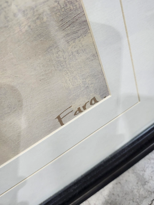 The Color Purple by Fara. Large framed abstract art print. Features muted purples, creams, and greys. Black frame. Ready to hang. Measures 35" by 35"