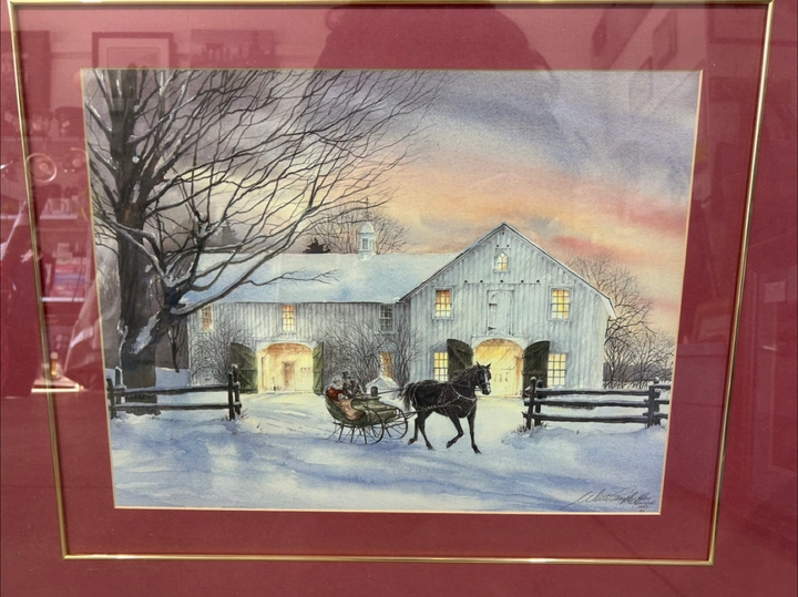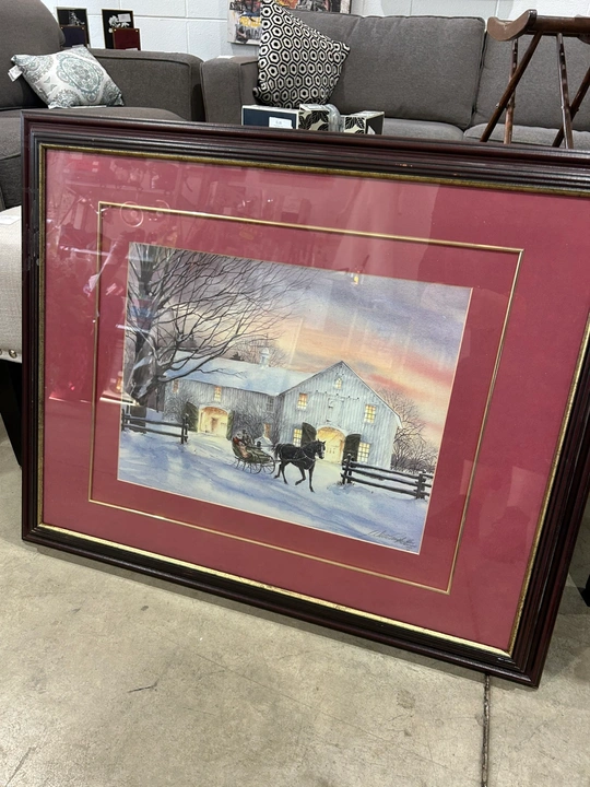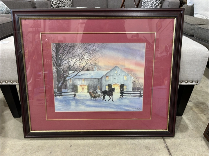 Beautiful framed watercolour print. Depicts a winter scene with a horse-drawn sleigh approaching a barn. Dark brown frame with a maroon mat. A lovely piece for your home.
