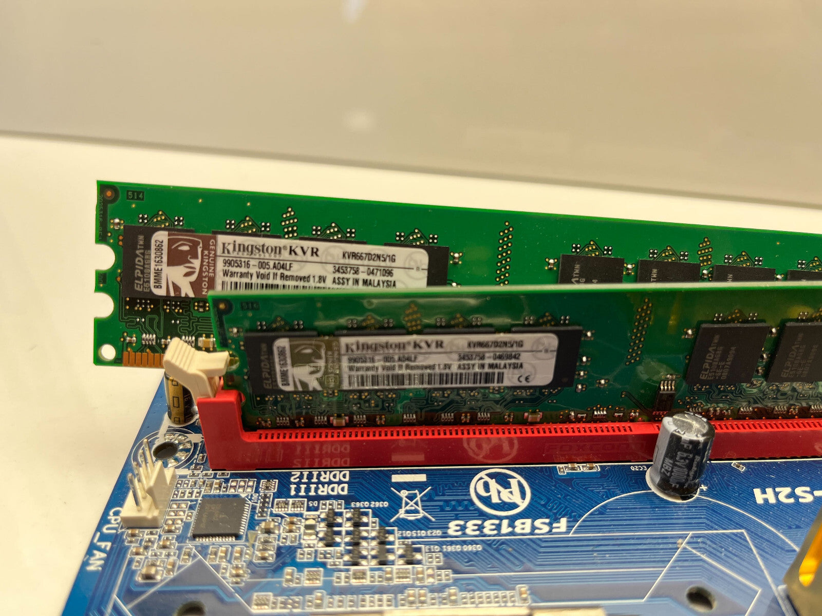 This microATX GA-73PVM-S2H motherboard from Gigabyte is powered by an nVidia nForce 630i/Geforce 7100 chipset and has an Intel Pentium 4 3.2GHz (SL9KF) and 2GB of RAM (2x1GB Kingston KVR DIMMs) installed, and is perfect for your next retro PC build.