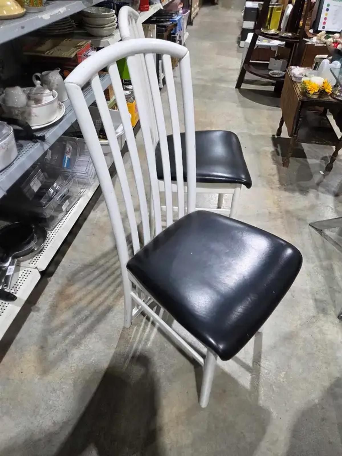 This is a used glass dining table, perfect for any dining room. It features a clear glass top and a unique chrome base that adds a touch of modern elegance. The set includes 3 chairs with white frames and black vinyl seats, offering a comfortable seating arrangement. One of the chrome legs is a little loose it just needs some slight DIY.