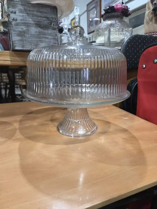 Elevate your desserts with this elegant glass cake stand with dome. Perfect for showcasing your culinary creations at parties or as a stylish kitchen display.