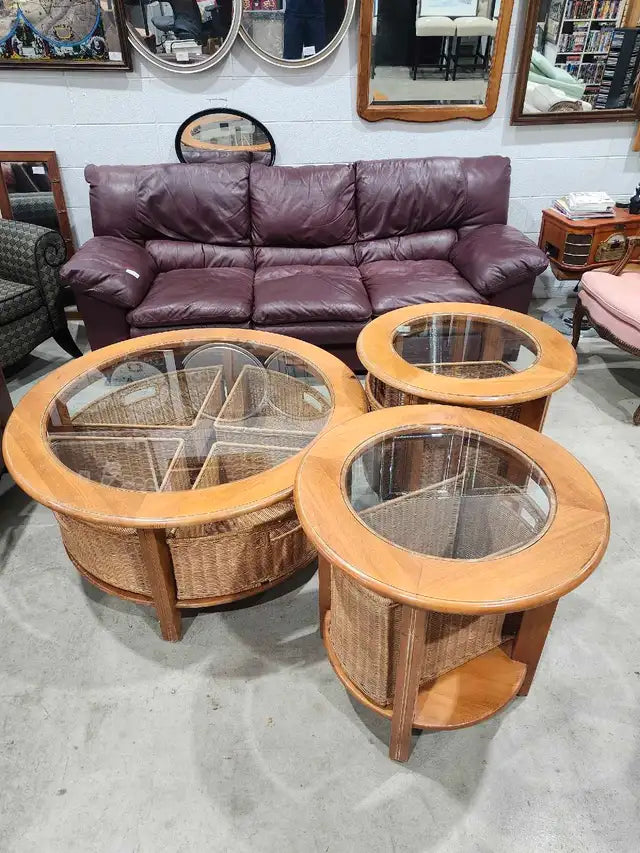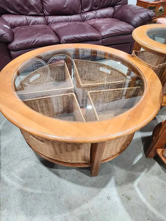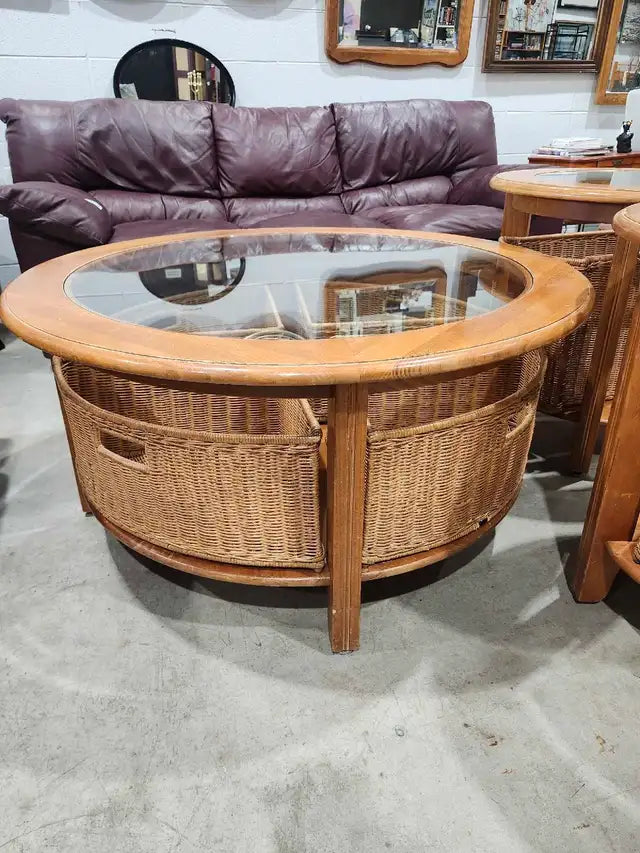 This used 3-piece table set features a round coffee table with a glass top and 4 woven baskets in the base, accompanied by two matching end tables, also with glass tops and woven basket bases. This set offers a blend of style and functionality, perfect for adding a touch of rustic charm to any living space. The items show some signs of wear consistent with their use, but overall they remain in great condition. - Includes one coffee table and two end tables - Glass tops for easy cleaning - Woven basket bases provide storage and unique style - Coffee table Measures 42" and 20" tall. Side tables 26" and 25" tall. 6215 3rd St SE, Unit C11 - Rebound Centre Daily 10 AM – 5 PM Local pickup/Delivery available (for a fee depending on location/item). Feel free to drop us a message or visit us in store.
