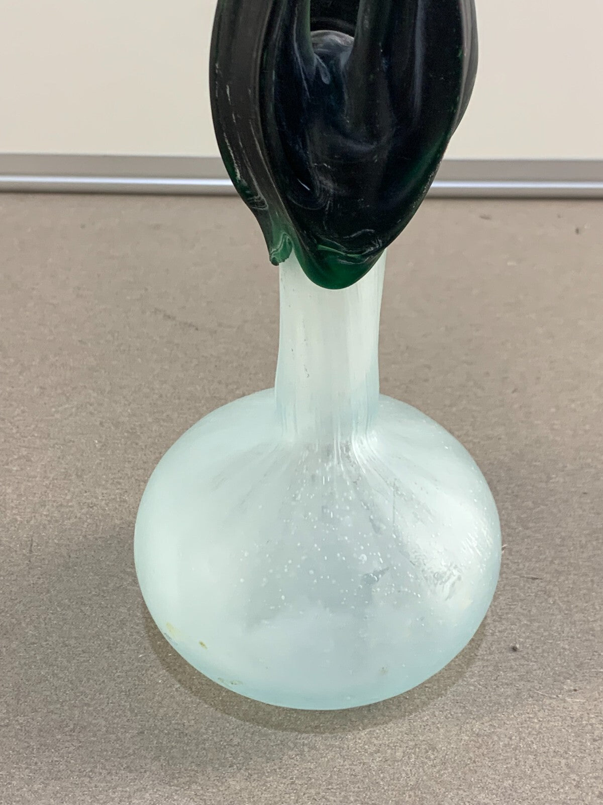 The product is a glass swung vase that is unmarked in terms of brand. This elegant vase is made of glass and is perfect for holding flowers or decorative items in any room of the house. Its sleek design and delicate material make it a stylish addition to any home decor.