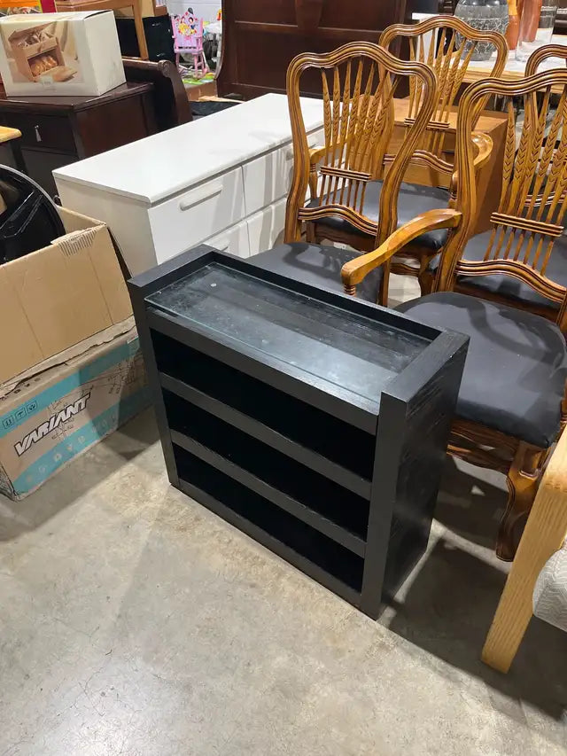 This is a used glass top shelf with built-in shelving units. It is perfect for a small space where you need to display items. This shelf has some wear and tear but remains sturdy and functional. * Black Wood Finish * Glass Top * 3 Shelves Measurements: Length: 26” Width: 10” Height: 27” The price is $45+5%GST 6215 3rd St SE, Unit C11 - Rebound Centre Daily 10AM - 5PM
