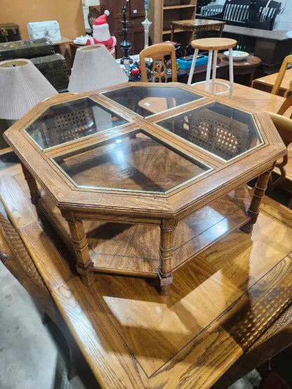 Add a touch of elegance to your living space with this set of used glass top tables, including a unique octagon-shaped coffee table and two matching end tables. The glass inserts are clean and the wood frames are in great condition.