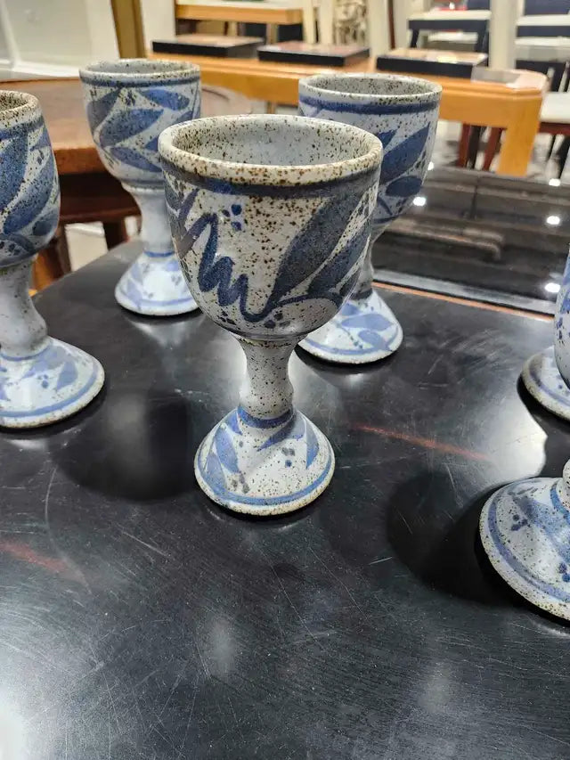 Add a touch of artisanal charm to your table with these hand-painted goblets, perfect for sipping your favourite beverage in style. These unique goblets feature a beautiful blue and white design, showcasing delicate leaf patterns. This set of six goblets are in used, but good condition.