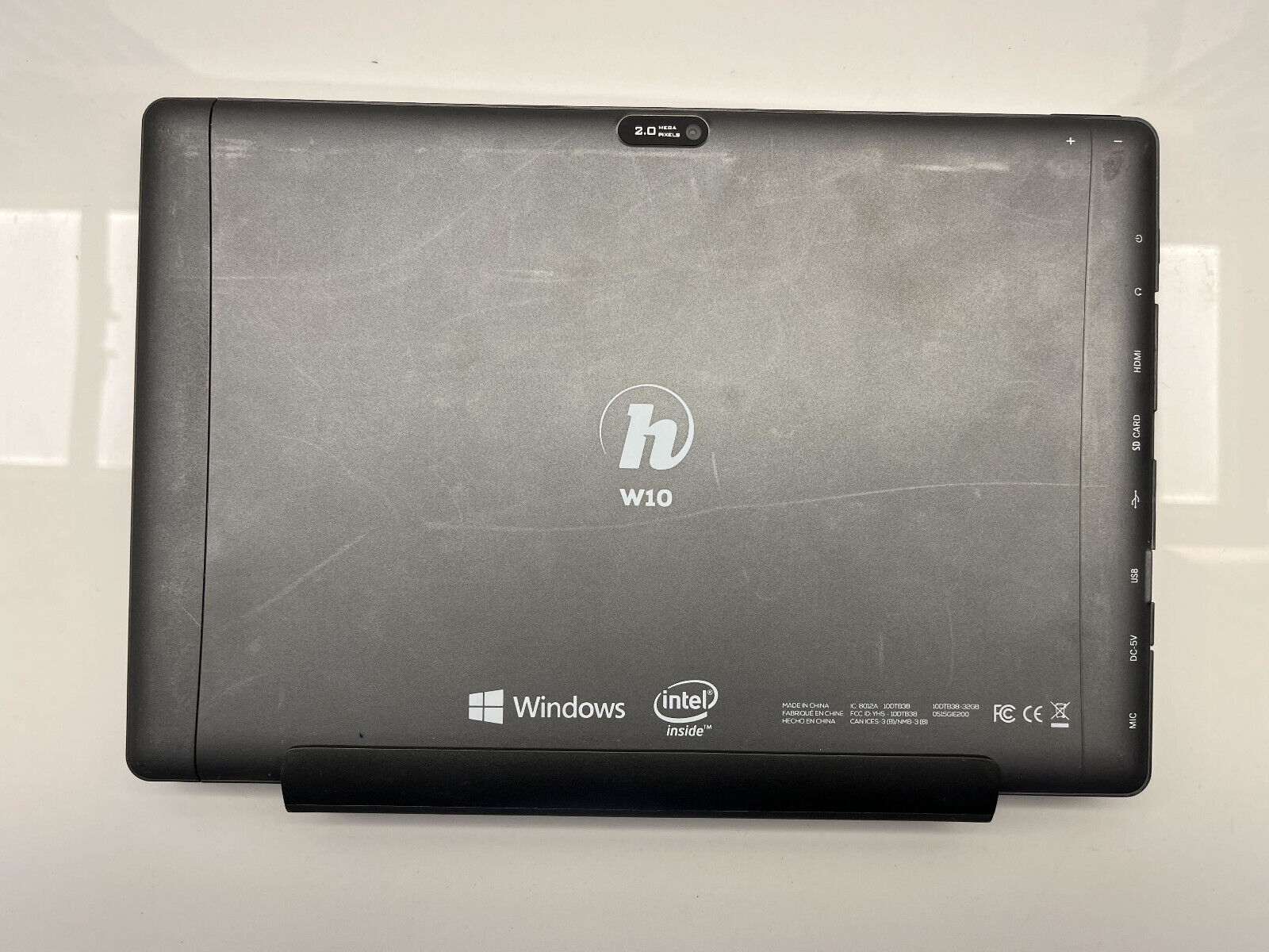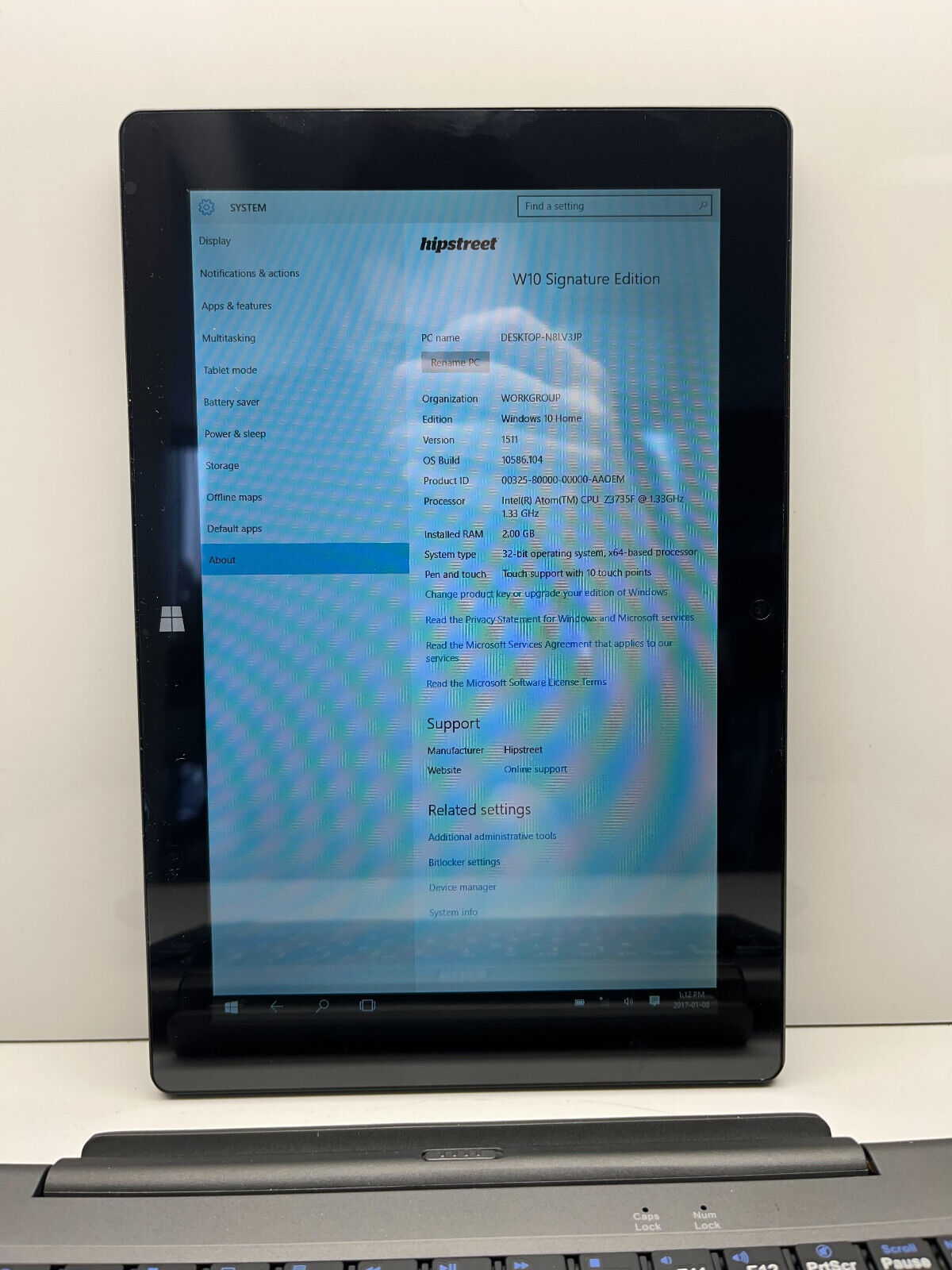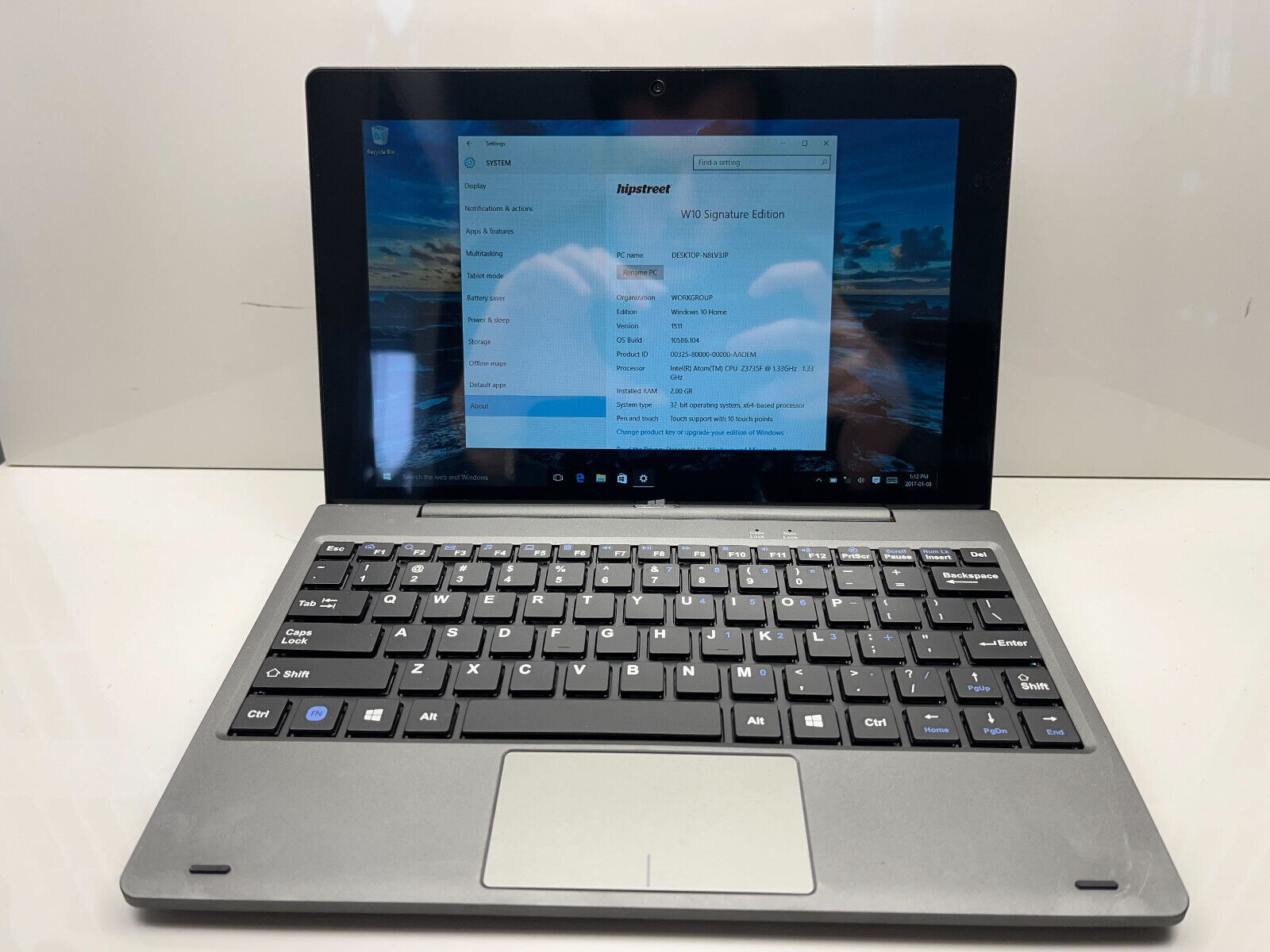 This W10 Pro 2-in-1 laptop/tablet from Hipstreet (model 10DTB38-32GB) is powered by an Intel Atom Z3735F processor running at 1.33 GHz with 2GB of RAM and 32GB of eMMC storage on board. With Windows 10 installed, this machine is ready to be used.