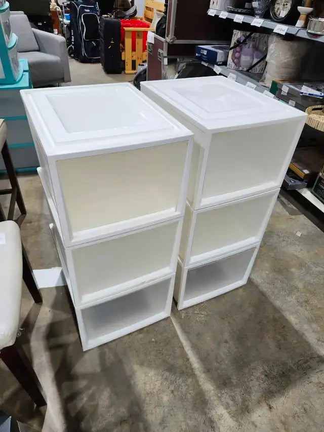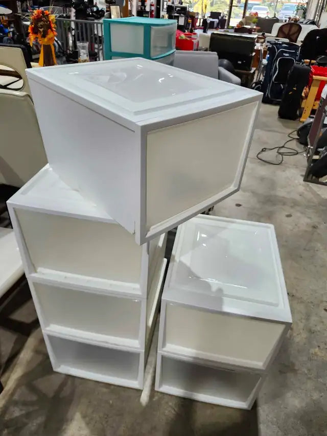 These are IKEA storage drawers that offer a practical and stylish storage solution. The units feature smooth-gliding drawers and a clean white finish, making them suitable for various rooms. $15 per drawer - 6 available