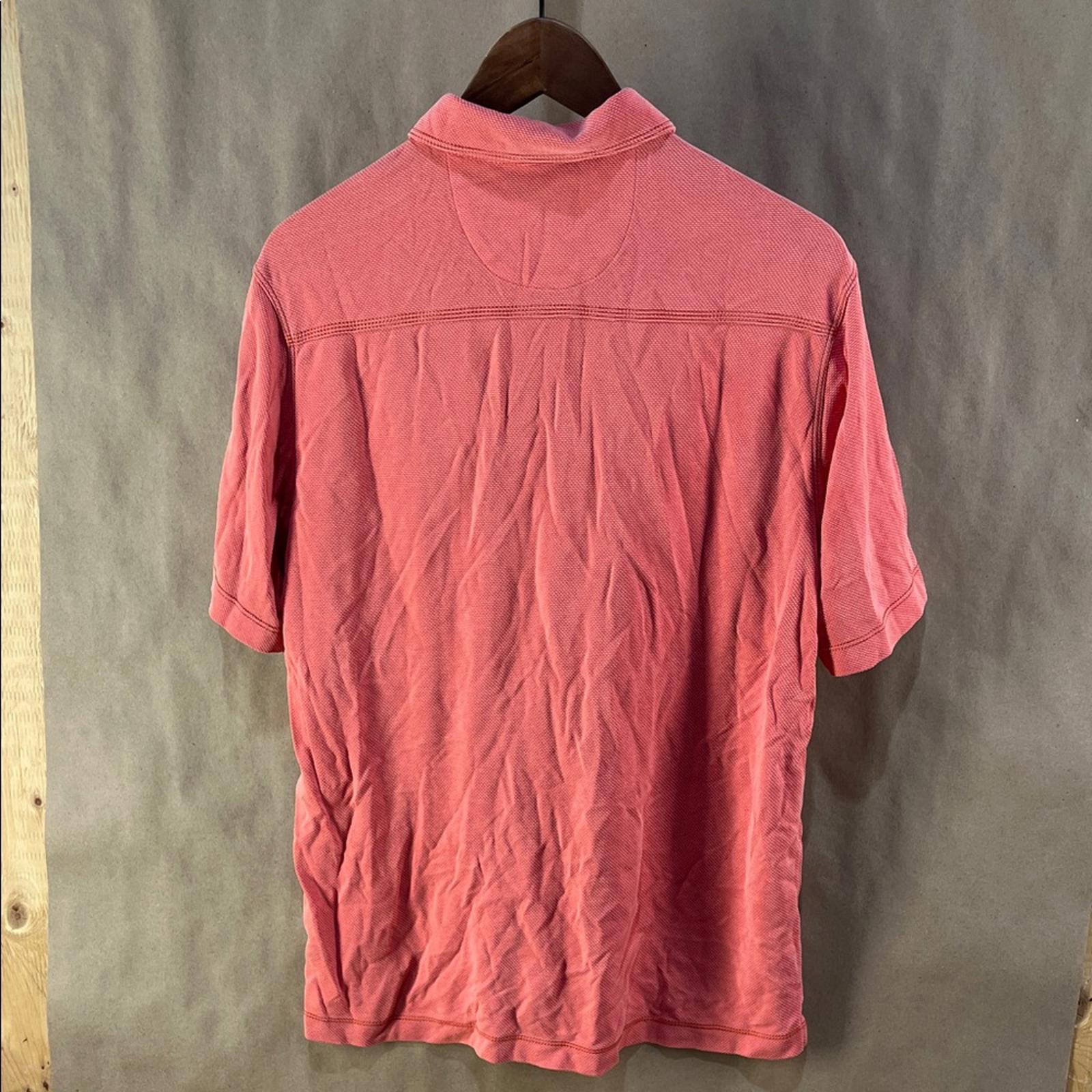 This Johnston & Murphy men’s polo shirt features a fresh coral color and a timeless, versatile design. Comfortable and easy to wear, it’s perfect for casual outings, work-casual looks, or warm-weather wear. Men’s size Medium and in good condition, showing light, normal wear.
