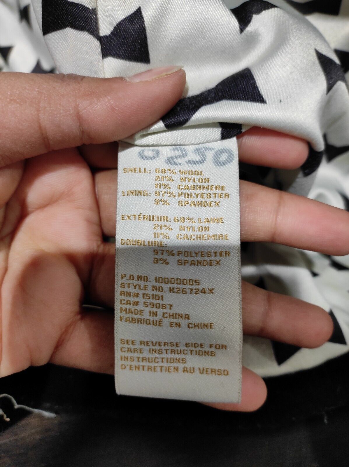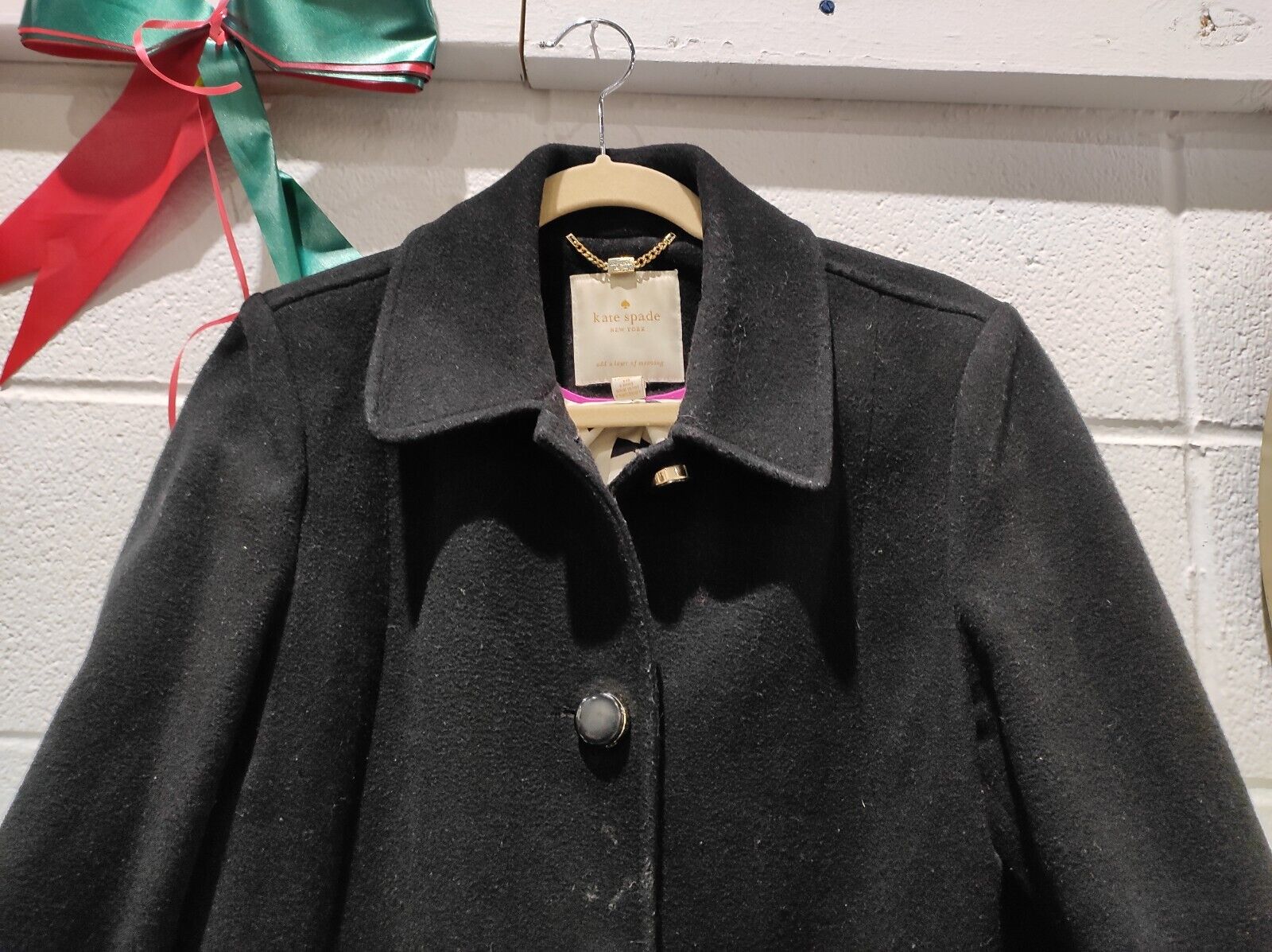 Brand: Kate SpadeSize: LargeColor: BlackMaterial: Wool blend for warmth and durabilityFeatures bow pockets for a playful, feminine touchClassic, sleek, and tailored designVersatile for both casual and formal wearNote: A quick wash will be required before use