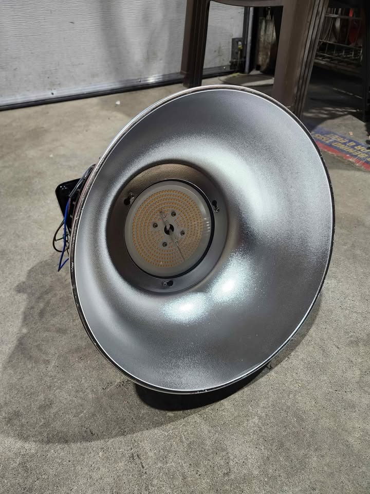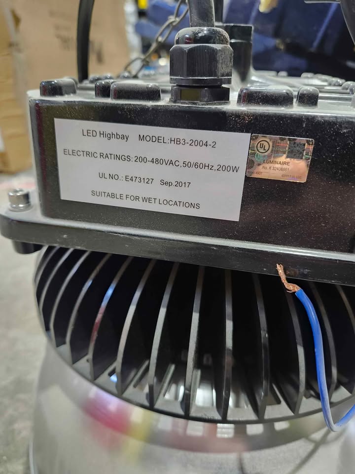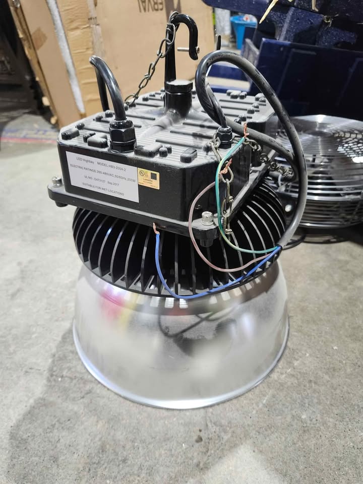 Used Luminaire LED Highbay light, model HB3-2004-2, suitable for wet locations and rated for 200-480VAC at 50/60Hz, 200W. This light has been previously used, but remains in good working condition. The reflector is in good condition.