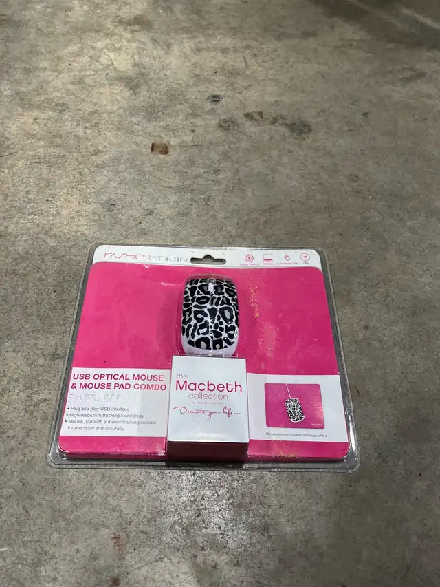 Add some flair to your workspace with this new Macbeth Collection silver leopard USB optical mouse and mousepad combo. This stylish set features a plug-and-play USB interface and high-resolution tracking technology. The mousepad provides a superior tracking surface for precision and accuracy. Specifications: * Plug and play USB interface * High-resolution tracking technology * Mouse pad with superior tracking surface for precision and accuracy The price is $10+5%GST 6215 3rd St SE, Unit C11 - Rebound Centre Daily 10AM - 5PM