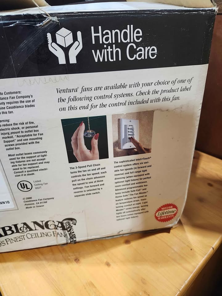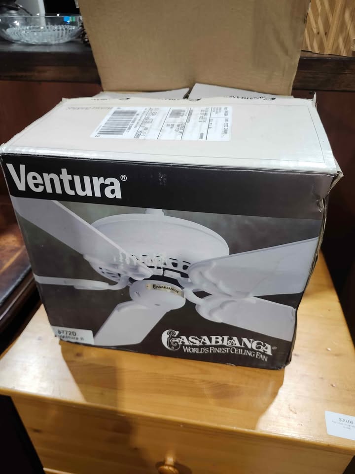 Selling a Casablanca Ventura II Series 6772D ceiling fan. It features an architectural white motor and a 3-speed pull chain. The box shows some wear, but the fan itself is in new and ready to install. 6215 3rd St SE, Unit C11 - Rebound Centre Daily 10 AM – 5 PM Local pickup/Delivery available