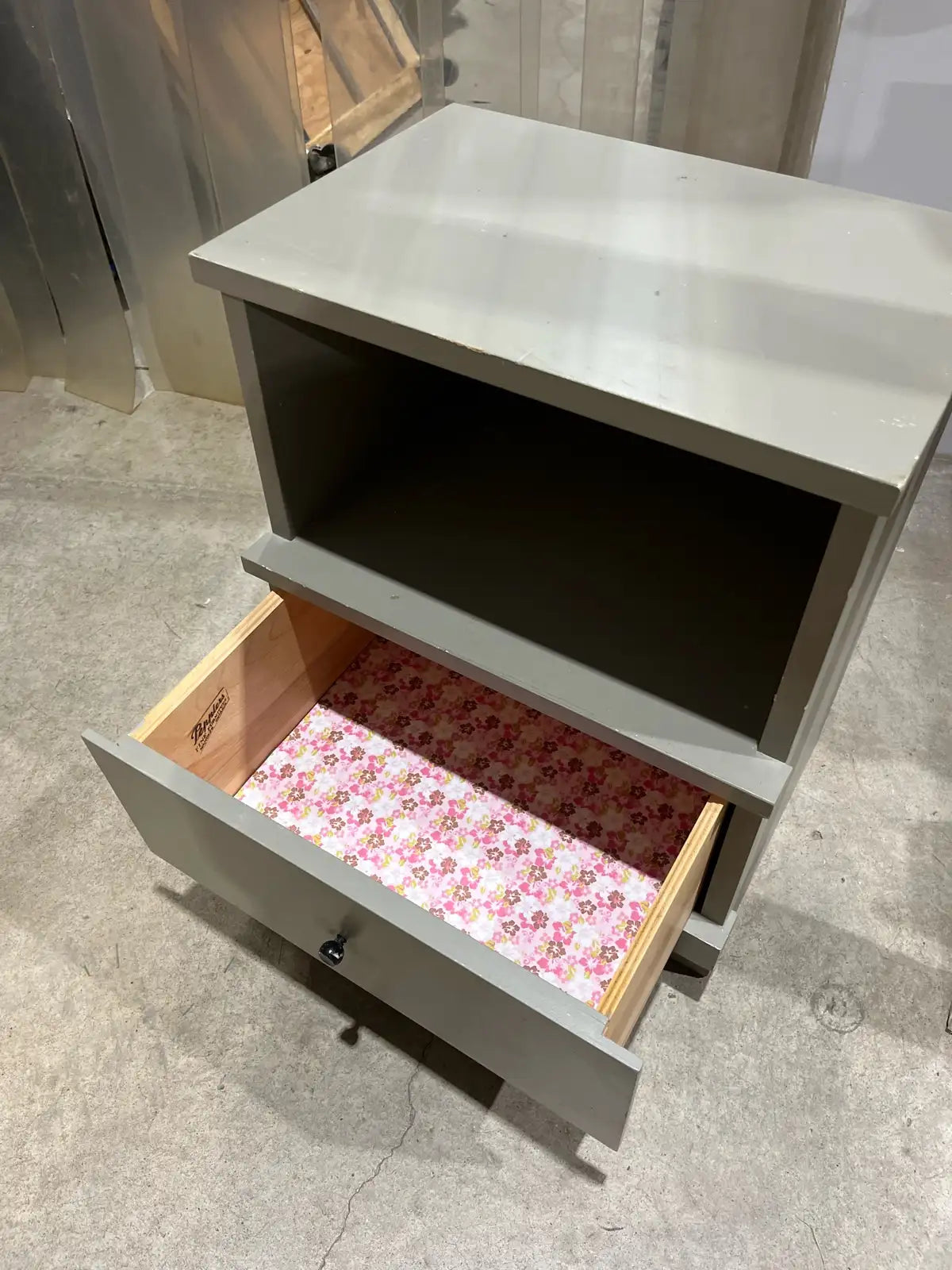 This grey nightstand is perfect for adding a touch of modern charm to your bedroom; it features an open shelf and a drawer for convenient storage. This item is in used condition. Additional details include: * Colour: Grey * One drawer with floral lining * Open shelf for extra storage Measurements: Length: 19” Width: 13.5” Height: 24” The price is $25+5%GST 6215 3rd St SE, Unit C11 - Rebound Centre Daily 10AM - 5PM