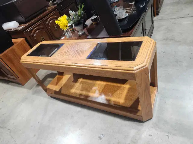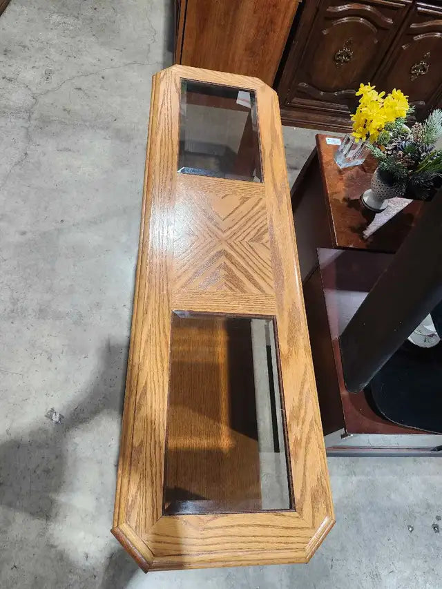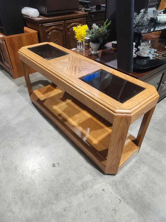 This is a used oak console/entryway table with glass inserts and a bottom shelf, perfect for adding a touch of elegance to your living room. This table is in good condition and has been well-maintained. measures at 56" long, 18" deep and 26.5" tall. * Material: Oak wood with glass inserts * Style: Traditional * Features: Bottom shelf for extra storage 6215 3rd St SE, Unit C11 - Rebound Centre Daily 10 AM – 5 PM Local pickup/Delivery available (for a fee depending on location/item). Feel free to drop us a message or visit us in store. Prices subject to GST See more at Reboundcentre.com