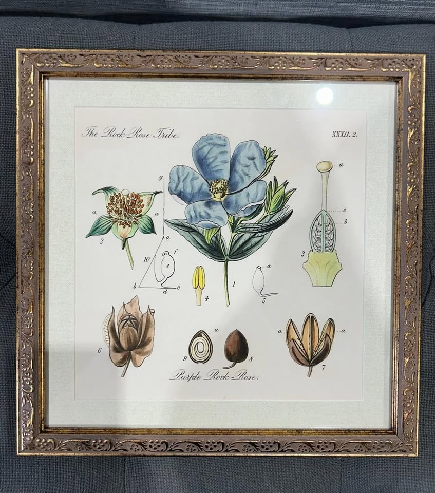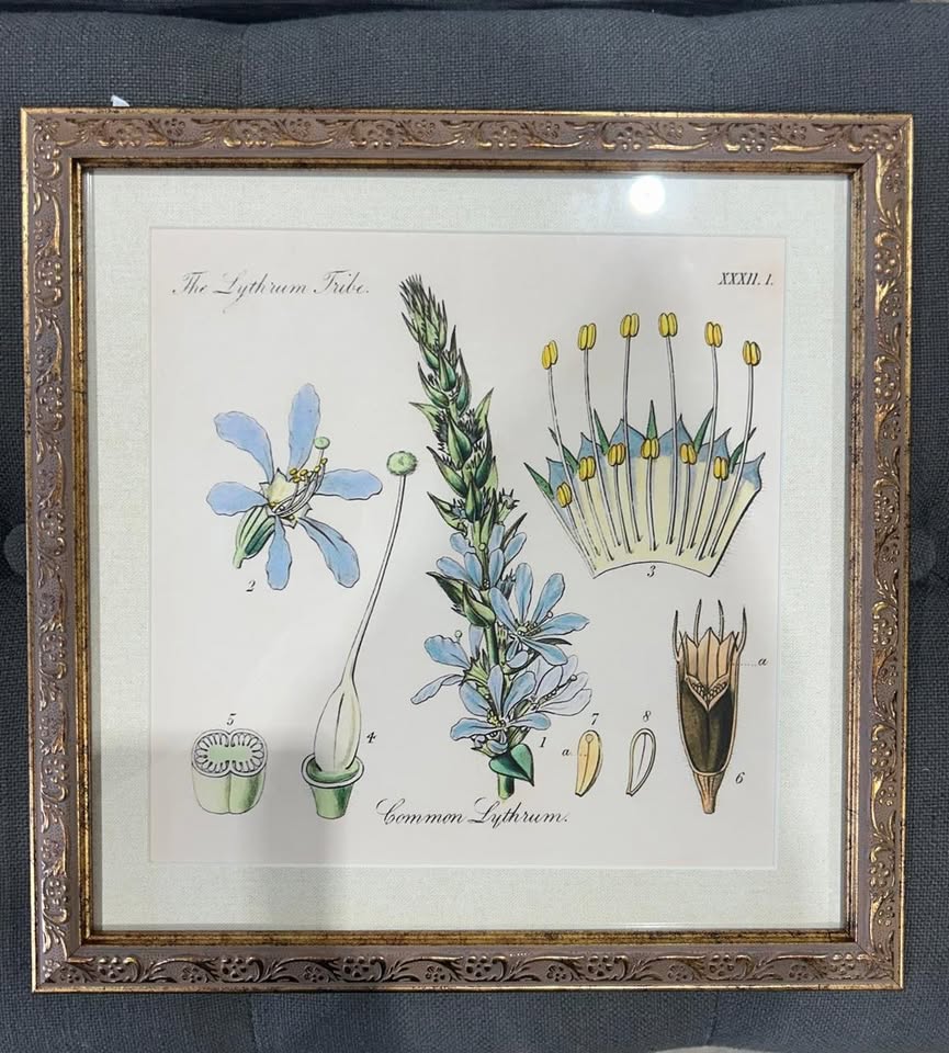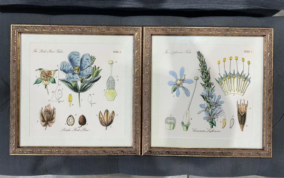 Two framed botanical prints. Detailed illustrations of Purple Rock Rose and Common Lythrum. Ornate gold frames. Perfect for a home office or living room.