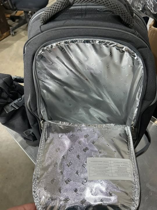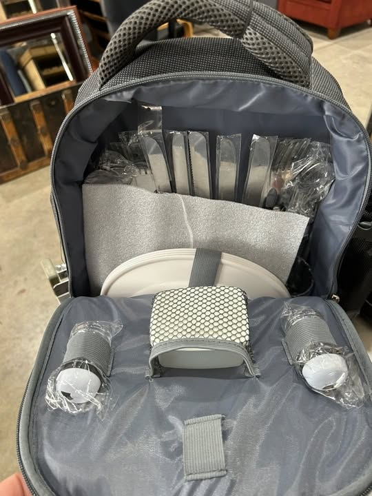 Grey fabric picnic backpack. Includes cutlery, plates, wine glasses, napkins and more. Insulated compartment. Great for outdoor adventures.