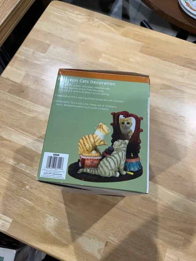 This charming polyresin cats decoration features two adorable cats admiring themselves in a mirror, still in its original packaging and in new condition. This decorative piece is perfect for adding a touch of whimsy to any room. The price is $15+5%GST 6215 3rd St SE, Unit C11 - Rebound Centre Daily 10AM - 5PM